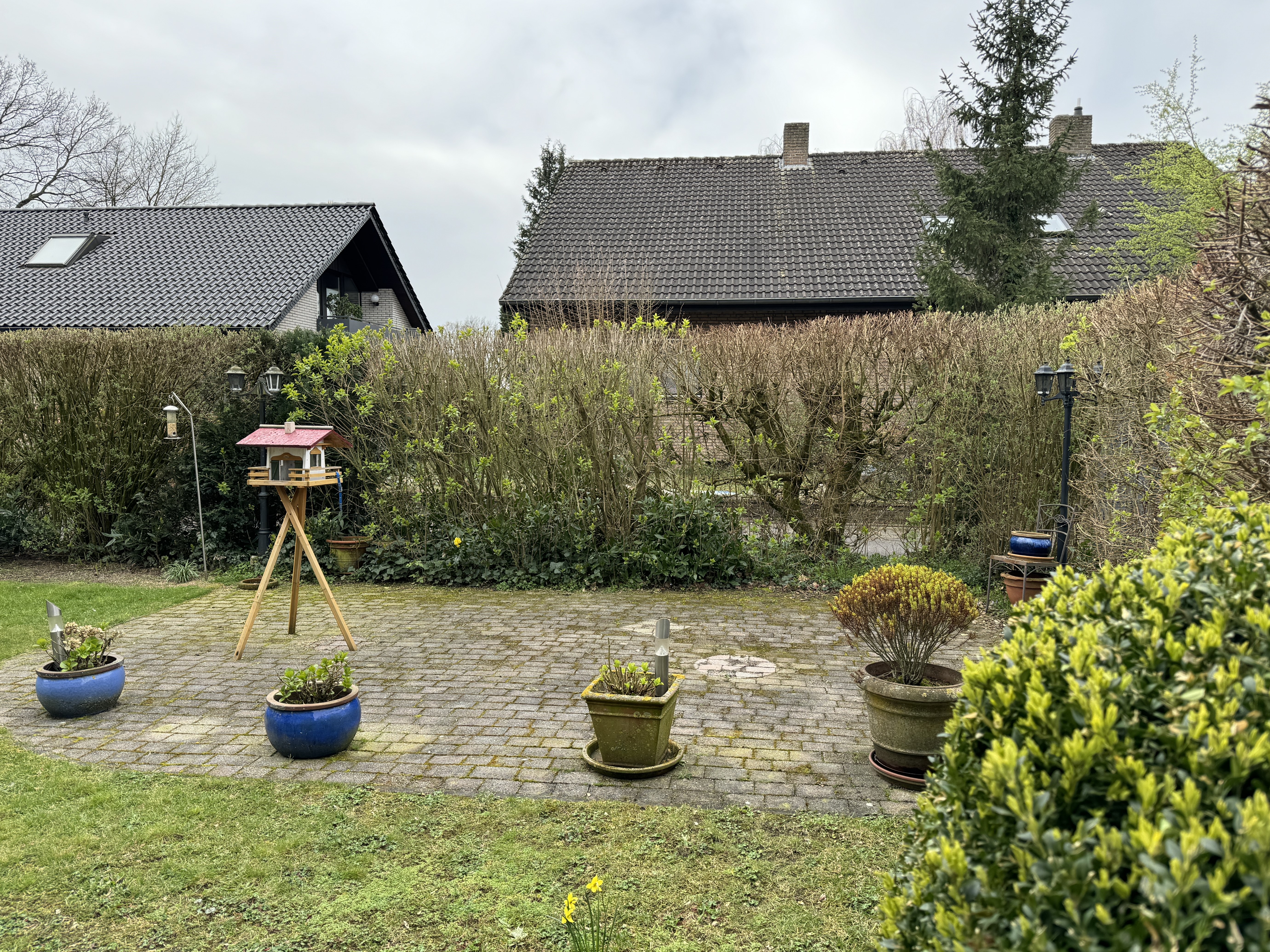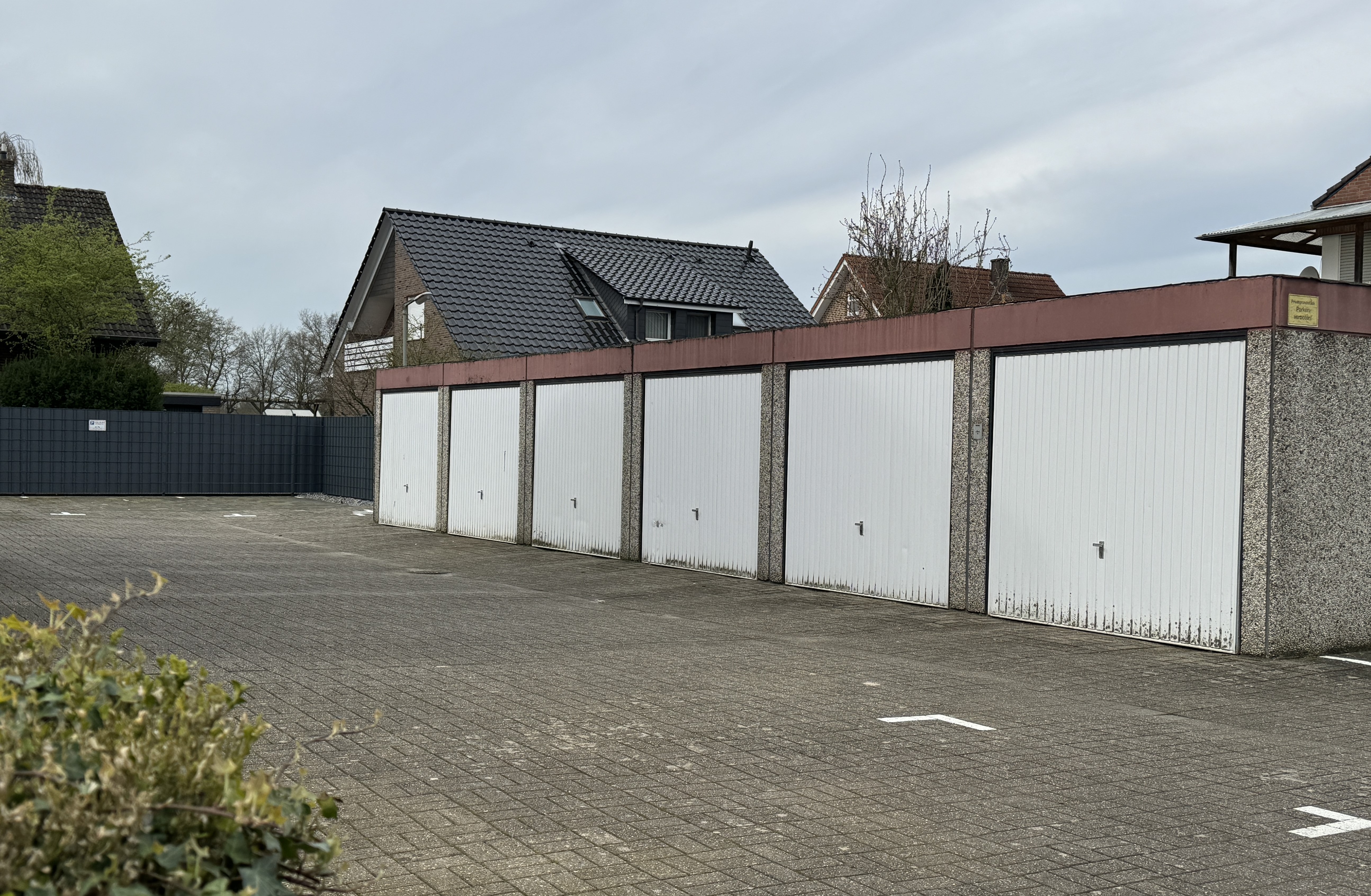 Seitlich am Haus liegen die Garagen, eine davon gehört zur Wohnung.