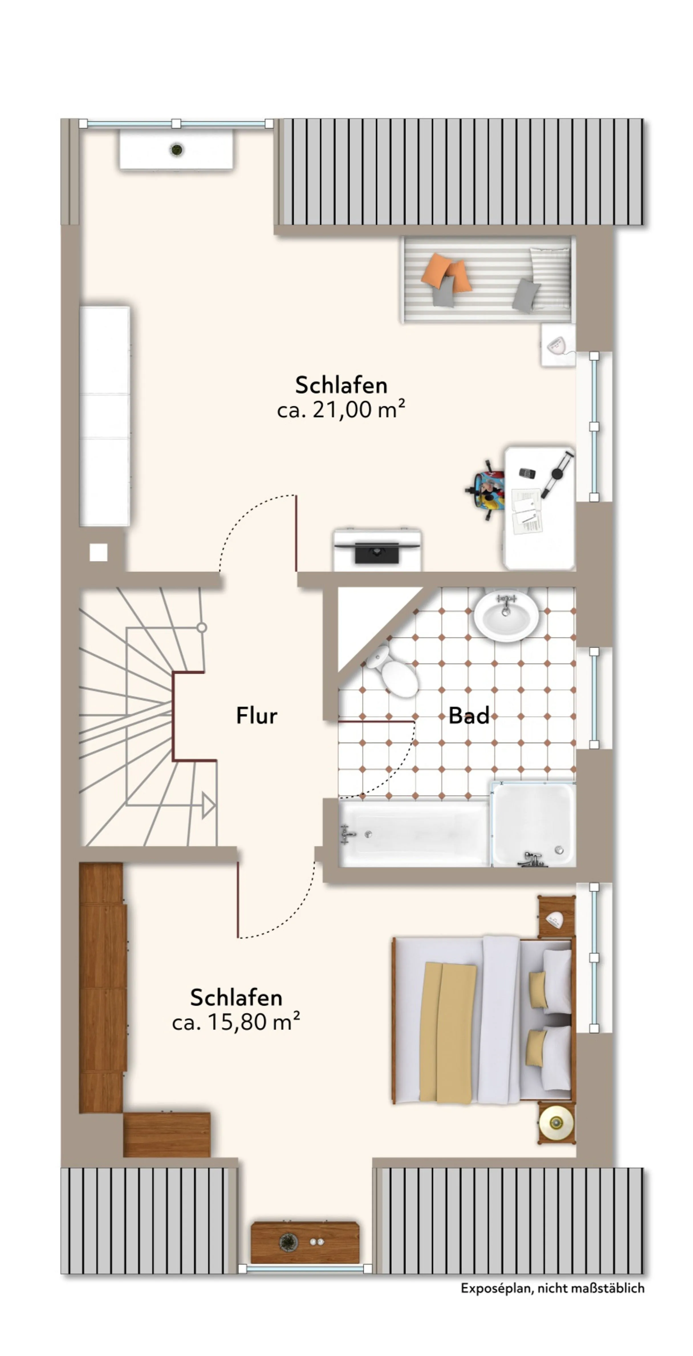 Im Obergeschoss erwarten Sie zwei gut geschnittene Schlafräume mit Parkettboden: ein großzügiges Elternschlafzimmer mit ca. 16 m² sowie ein besonders großes Kinderzimmer mit ca. 21 m². Das helle Badezimmer ist funktional ausgestattet mit Badewanne, Dusche, Fenster und ebenfalls angenehmer Fußbodenheizung.