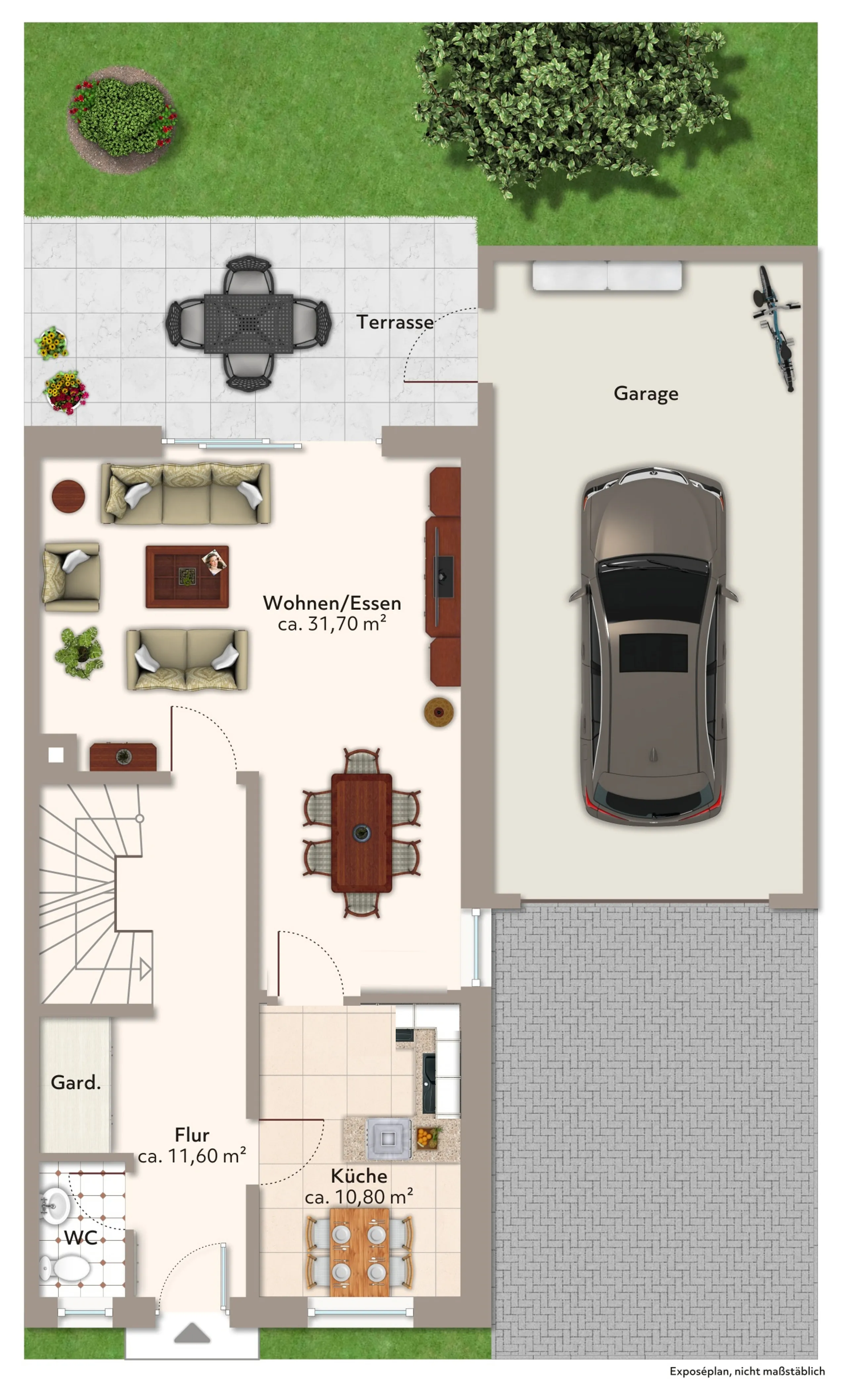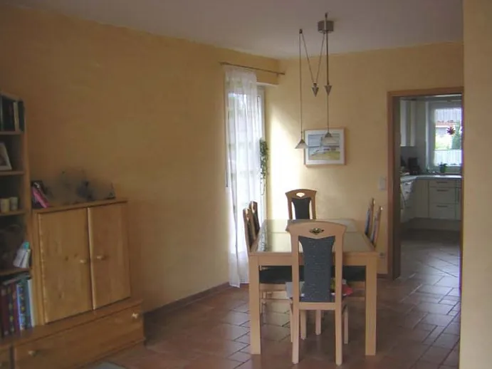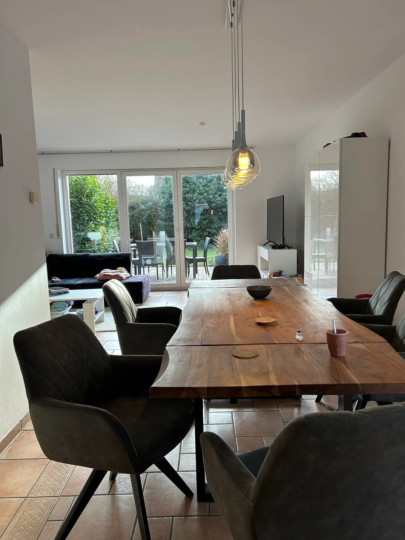 Schon beim Betreten des Hauses empfängt Sie das Erdgeschoss mit warmen Terrakottafliesen und einer durchgängigen Fußbodenheizung, die für behaglichen Komfort sorgt. Herzstück ist das großzügige, über Eck gestaltete Wohn- und Esszimmer, das viel Platz für gemeinsame Stunden bietet. Von hier aus gelangen Sie direkt auf die sonnige Südterrasse und in den grünen Garten – ideal für entspannte Nachmittage oder gesellige Abende im Freien. Die angrenzende Küche mit ca. 11 m² überzeugt durch kurze Wege zum Essbereich und einen angenehmen Blick Richtung Straße. Ergänzt wird das Erdgeschoss durch ein Gäste-WC sowie eine praktische Garderobennische im Eingangsbereich.