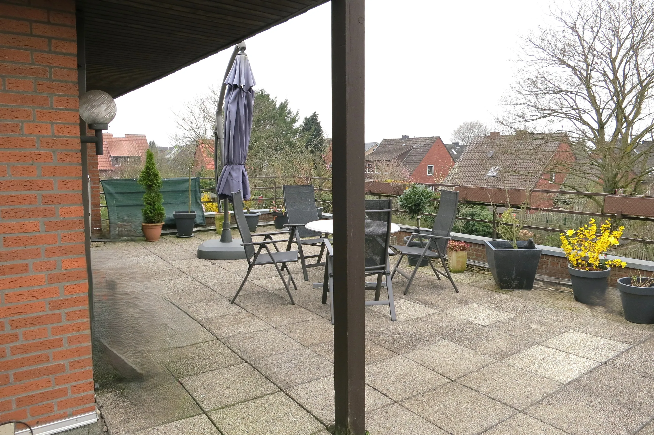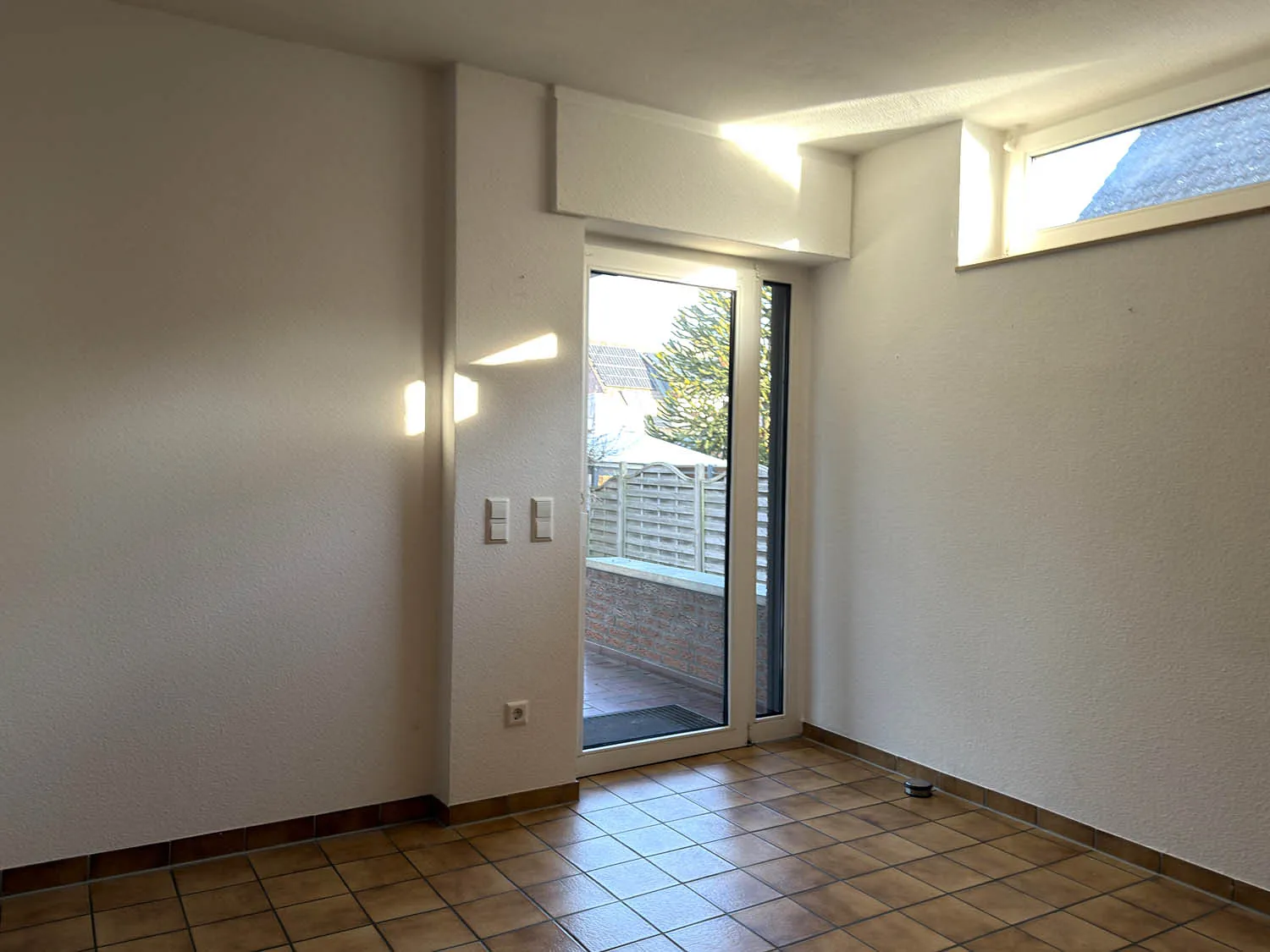 Im Obergeschoss befindet sich eine im Jahr 2010 vollständig sanierte Wohnung, die sich bis heute in einem äußerst gepflegten Zustand präsentiert. Auf großzügigen 87 m² verteilen sich drei gut geschnittene Zimmer. Elegante, hellbeige Steinfliesen prägen die Wohnräume und verleihen der Wohnung eine zeitlose, hochwertige Ausstrahlung. Das Wohn- und Esszimmer überzeugt durch seine angenehme Größe und ein großes Panoramafenster mit Blick auf die ca. 30 m² große Dachterrasse. Diese bietet nahezu ganztägige Sonne und einen herrlichen Blick in den Garten – ein echtes Highlight. Das große Schlafzimmer, ein Arbeitszimmer, das modern gestaltete Bad mit Badewanne und Dusche sowie ein praktischer Abstellraum sind über einen separaten Flur erreichbar und schaffen eine angenehme, private Wohnatmosphäre. Die Wohnung ist derzeit für 620 € Kaltmiete vermietet und bietet somit eine solide Unterstützung bei der Finanzierung.