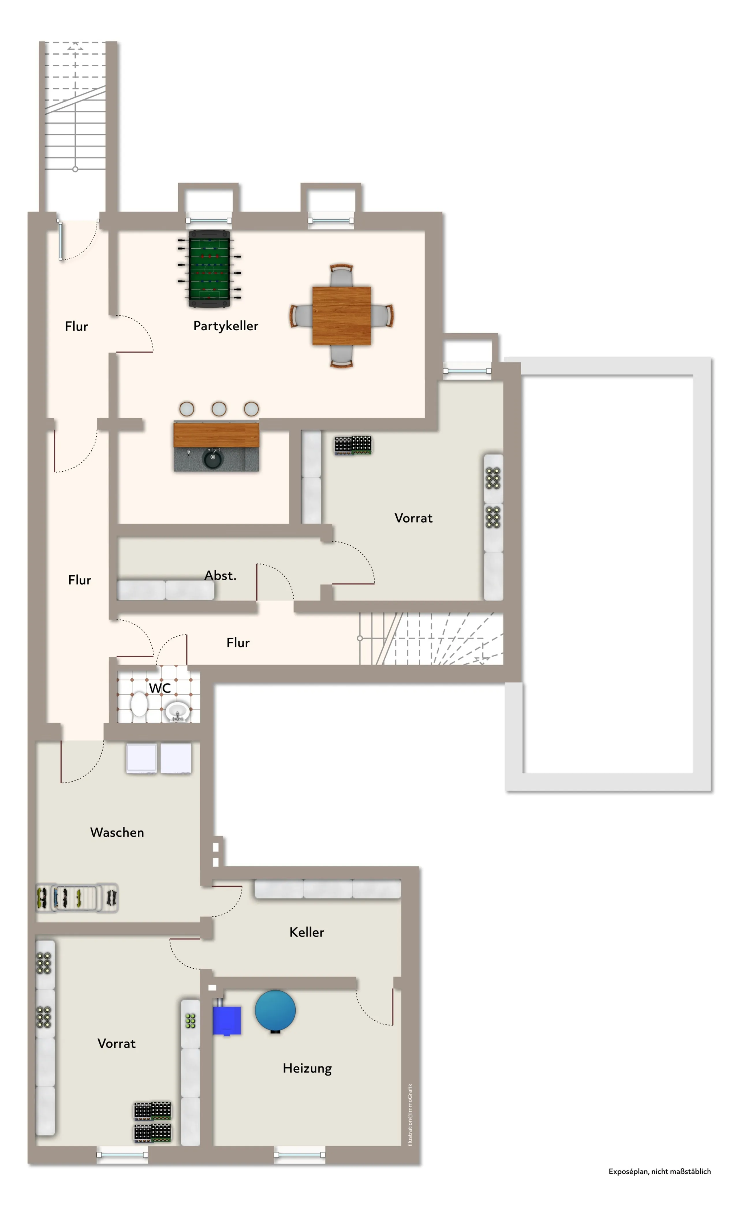 Das Erdgeschoss bietet mit rund 141 m² viel Raum zur Entfaltung. Die Bodenbeläge sowie das Badezimmer und das Gäste-WC entsprechen nicht mehr dem heutigen Zeitgeschmack und könnten modernisiert werden. Genau darin liegt jedoch Ihre Chance, eigene Vorstellungen umzusetzen und dem Haus eine persönliche Handschrift zu verleihen. Das Badezimmer verfügt mit über 11 m² über eine komfortable Größe und beste Voraussetzungen für eine moderne Neugestaltung. Drei weitere Zimmer mit Größen zwischen ca. 12,8 m² und 16,7 m² lassen sich flexibel als Schlafzimmer, Gästezimmer oder Büro nutzen. Die über 17 m² große, quadratisch geschnittene Küche bietet reichlich Platz für eine großzügige Küchenzeile und verfügt über einen direkten Zugang zur Terrasse. Herzstück des Erdgeschosses ist der beeindruckende, über 48 m² große Wohn- und Essbereich mit gemauertem Kamin. Die breite Glasfront sorgt für viel Tageslicht und eröffnet den Blick auf die große Terrasse mit Glasdach, auf der Sie auch bei wechselhaftem Wetter geschützt sitzen und gesellige Abende am Grill genießen können. Der angrenzende Garten ist grün eingewachsen und bietet neben Rasenflächen ausreichend Platz für Spielgeräte, Sandkasten oder Trampolin. Das Haus ist nahezu vollständig unterkellert und bietet neben Vorratsräumen einen Waschkeller, einen Partykeller sowie ein zusätzliches Gäste-WC. Die Gasheizung wurde im Jahr 2025 erneuert und entspricht damit einem zeitgemäßen technischen Standard. An einer Wand im Partykeller ist Feuchtigkeit vorhanden, deren Ursache geprüft werden sollte.