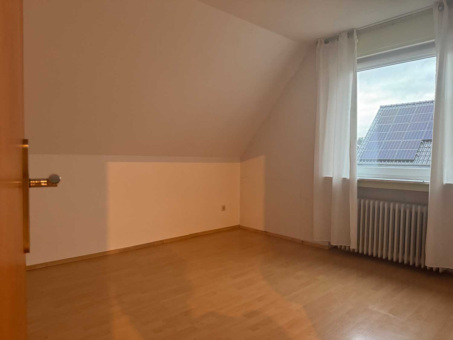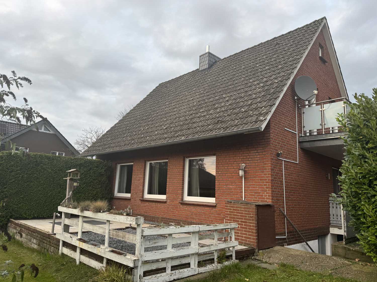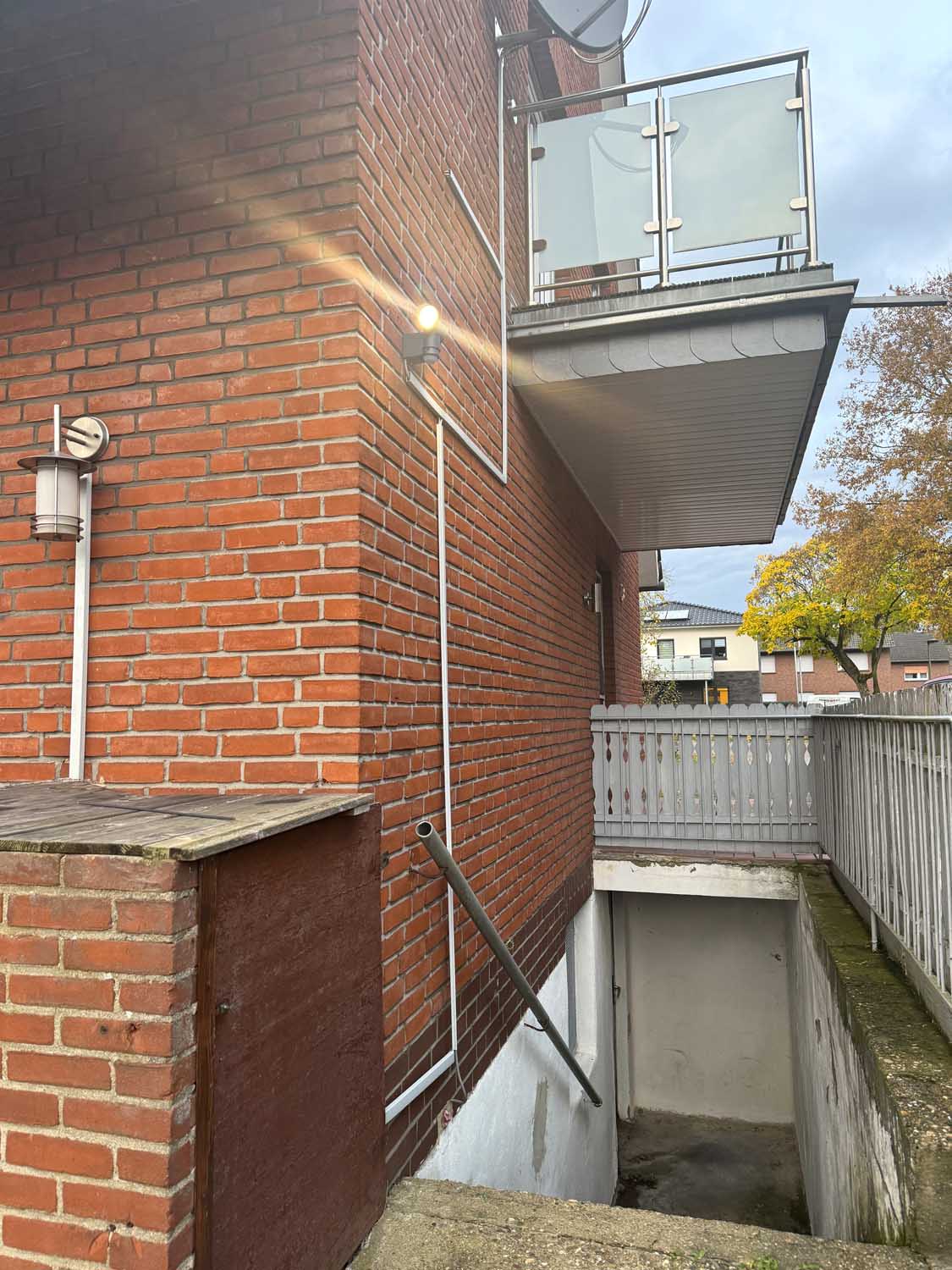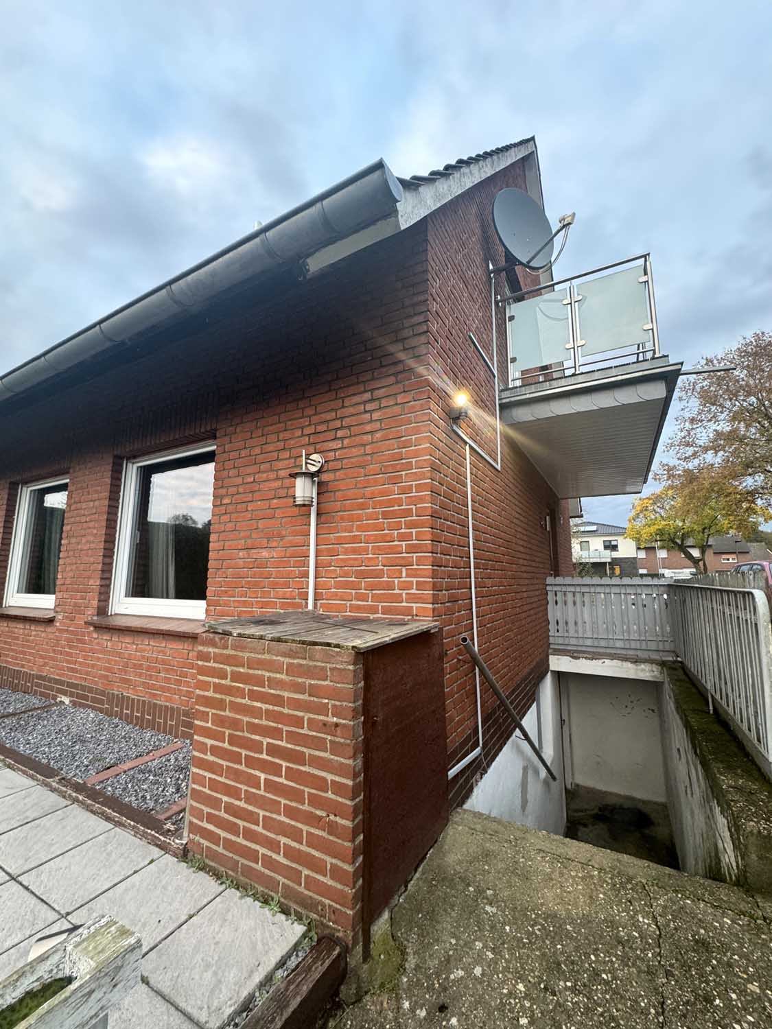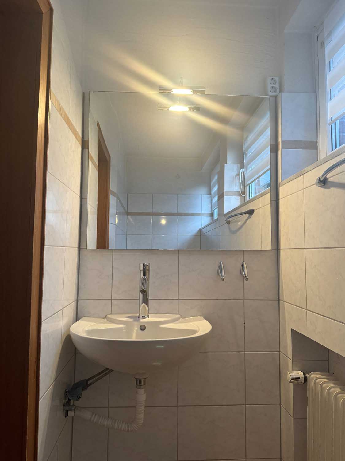 Mittig im Haus liegt das Treppenhaus, das uns ins Obergeschoss führt. Dort befinden sich drei weitere Räume mit knapp 10 m² bis ca. 17 m² und das Badezimmer. Derzeit ist das Badezimmer nur mit Duschwanne ausgestattet, aber es lässt sich leicht eine zusätzliche Dusche einbauen. Sie sehen, alles in allem ist das ein solides Haus für eine Familie mit Kindern oder mit benötigtem Platz für Homeoffice Büros. Einiges wurde schon renoviert, so gab es 2018 eine neue Gasheizung, neue Kunststofffenster im ganzen Haus und der Balkon wurde saniert und bekam ein neues Geländer.