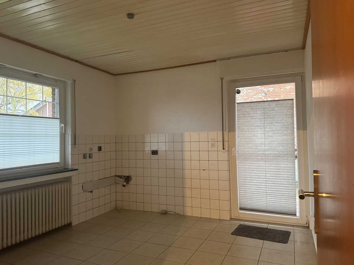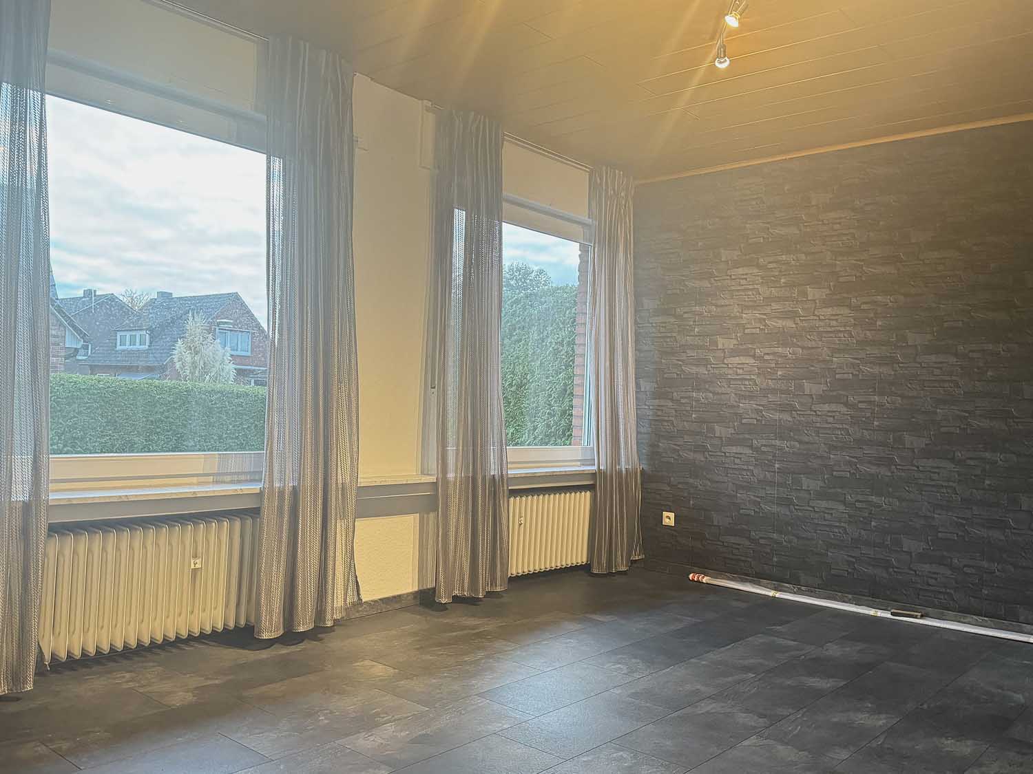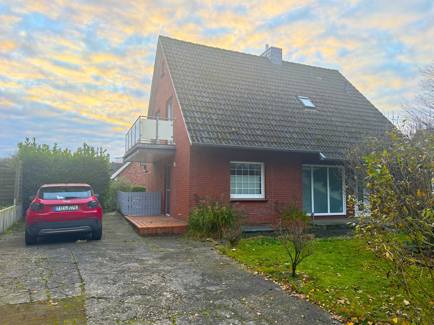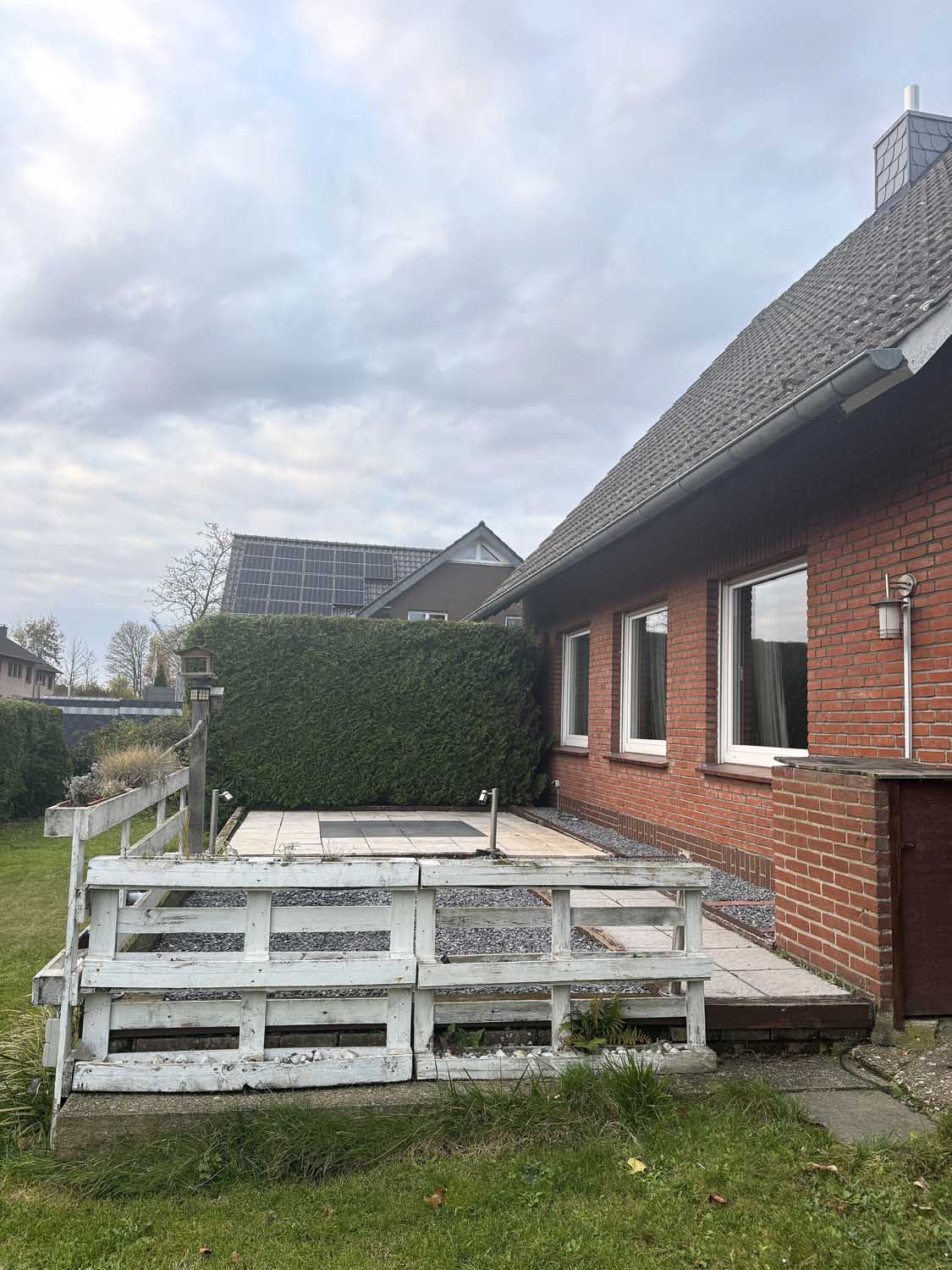 Aber schauen wir uns das tolle Haus doch einmal genauer an. Wir stehen vor dem Objekt und blicken links auf die lange Einfahrt. Hier finden Ihre Autos und auch die Autos Ihrer Besucher Platz. Dort links am Haus liegt auch die praktische Kelleraußentreppe. Nun gehen wir am gepflegten Vorgarten vorbei, betreten über eine Stufe die Haustür und stehen in der hellen Diele. Rechts an der Diele liegt das helle Gäste-WC mit Tageslichtfenster. Darüber freut sich nicht nur Ihr Besuch. Das Gäste-WC und auch das Badezimmer im Obergeschoss wurden 1994 renoviert. Geradeaus an der Diele gibt es ein ca. 15 m² großes Zimmer. Das könnte Ihr Schlafzimmer, das Büro oder auch ein Gästezimmer werden. Oder Sie planen einen Durchbruch zum danebenliegenden Wohnzimmer und machen aus dem ca. 21 m² großen Wohnraum einen ca. 36 m² großen Wohn- und Essbereich. Die Küche ist mit ca. 12 m² quadratisch geschnitten, sodass viel Platz für eine große Küchenzeile ist. Außerdem gibt es hier eine Seitentür, die direkt zum Pkw-Stellplatz führt, so kommen die Einkäufe schnell ins Trockene. Von dort gelangen Sie auch in den pflegeleicht mit Rasenfläche angelegten Garten und zur schönen ca. 12 m² großen Terrasse.