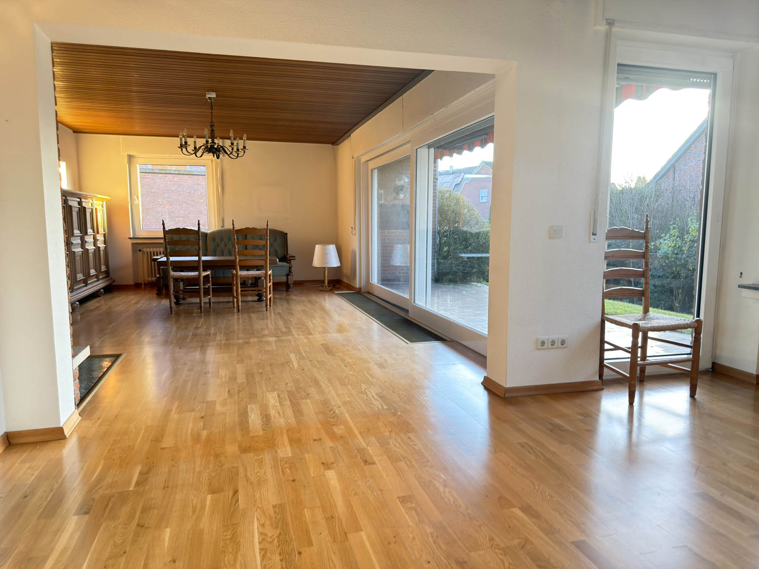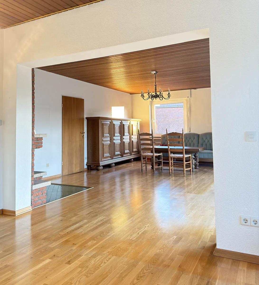 Schon beim Betreten empfängt eine geräumige Diele, die einen angenehmen ersten Eindruck vermittelt. Rechter Hand befindet sich ein kleines Gäste-WC, daneben ein praktischer Abstellraum für den Alltag. Geradeaus liegt die Küche, von der aus man direkt in den großzügigen Wohn- und Essbereich gelangt. Mit über 43 m², Kamin und hochwertigem Echtholzparkett ist dieser Raum klar das Herzstück des Hauses – offen, hell und ideal für gemeinsame Stunden. Große Glasflächen schaffen eine schöne Verbindung nach draußen und führen auf die Terrasse mit Markise. Von hier aus blickt man in den pflegeleichten Garten mit viel Rasenfläche, der zahlreiche Gestaltungsmöglichkeiten bietet.