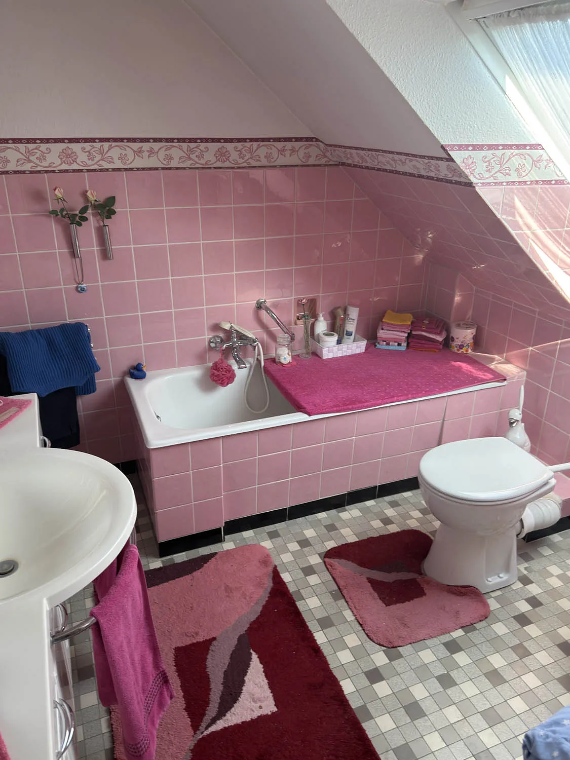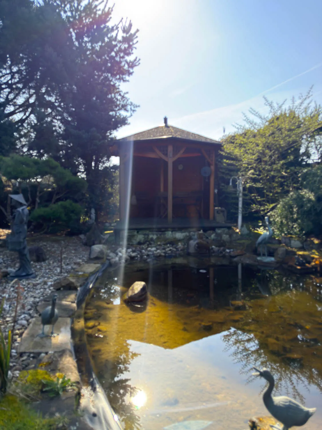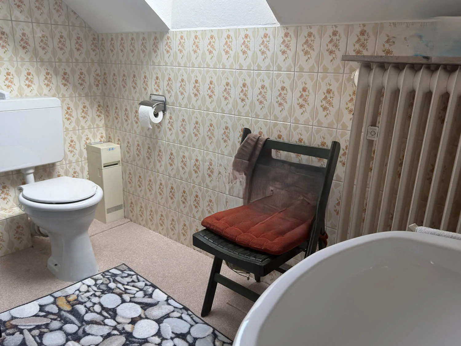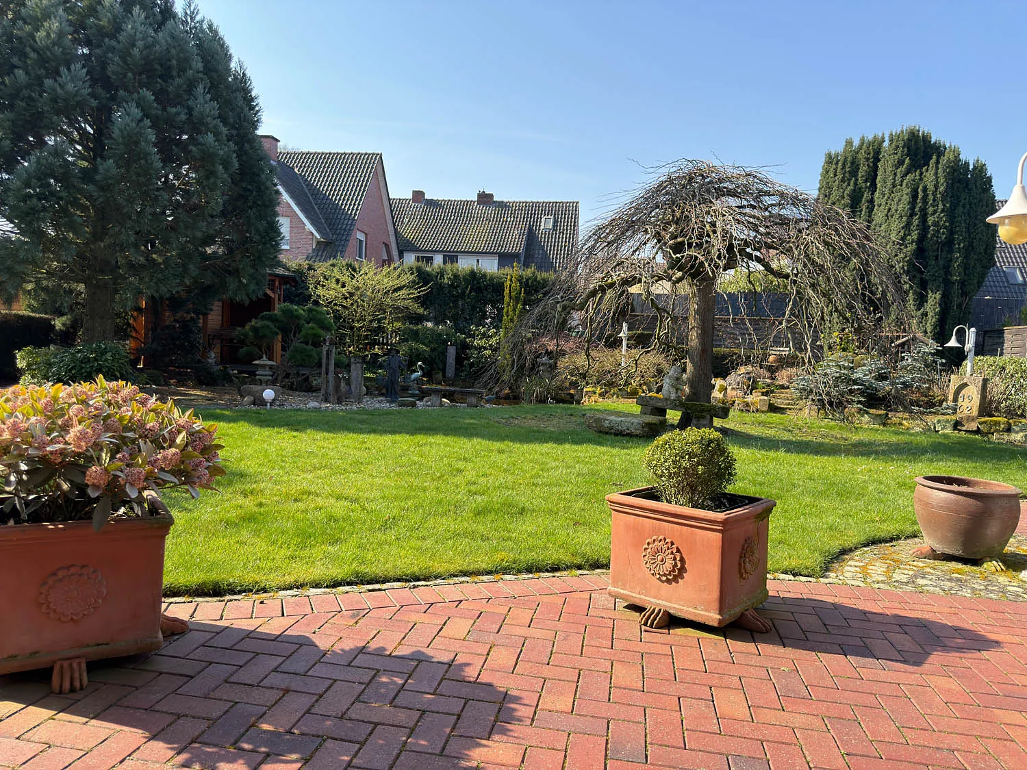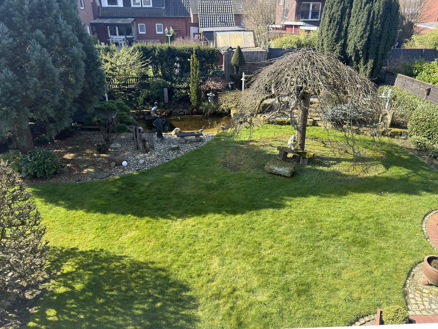 Hier eröffnet sich eine kleine grüne Oase: Weitläufige Rasenfläche, gewachsene Sträucher und liebevoll angelegte Steinbeete schaffen eine besondere Atmosphäre. Der idyllische Gartenteich mit dekorativen Elementen und die dahinterliegende, gemütliche Laube verleihen dem Außenbereich fast schon parkähnlichen Charakter. Ein zusätzlicher Freisitz bietet Ihnen auch bei Wind oder wechselhaftem Wetter einen geschützten Platz im Freien. Im Obergeschoss erwarten Sie zwei großzügige Schlafzimmer mit ca. 25 m² und ca. 15 m², beide mit direktem Zugang zum großen Balkon und herrlichem Blick in den eigenen Garten. Ergänzt wird diese Ebene durch ein weiteres Zimmer, ideal als Büro oder Gästezimmer, sowie ein Badezimmer mit Badewanne und Tageslichtfenster. Das Bad stammt aus dem Baujahr und bietet Ihnen die perfekte Grundlage, Ihre eigenen Ideen und Vorstellungen umzusetzen.