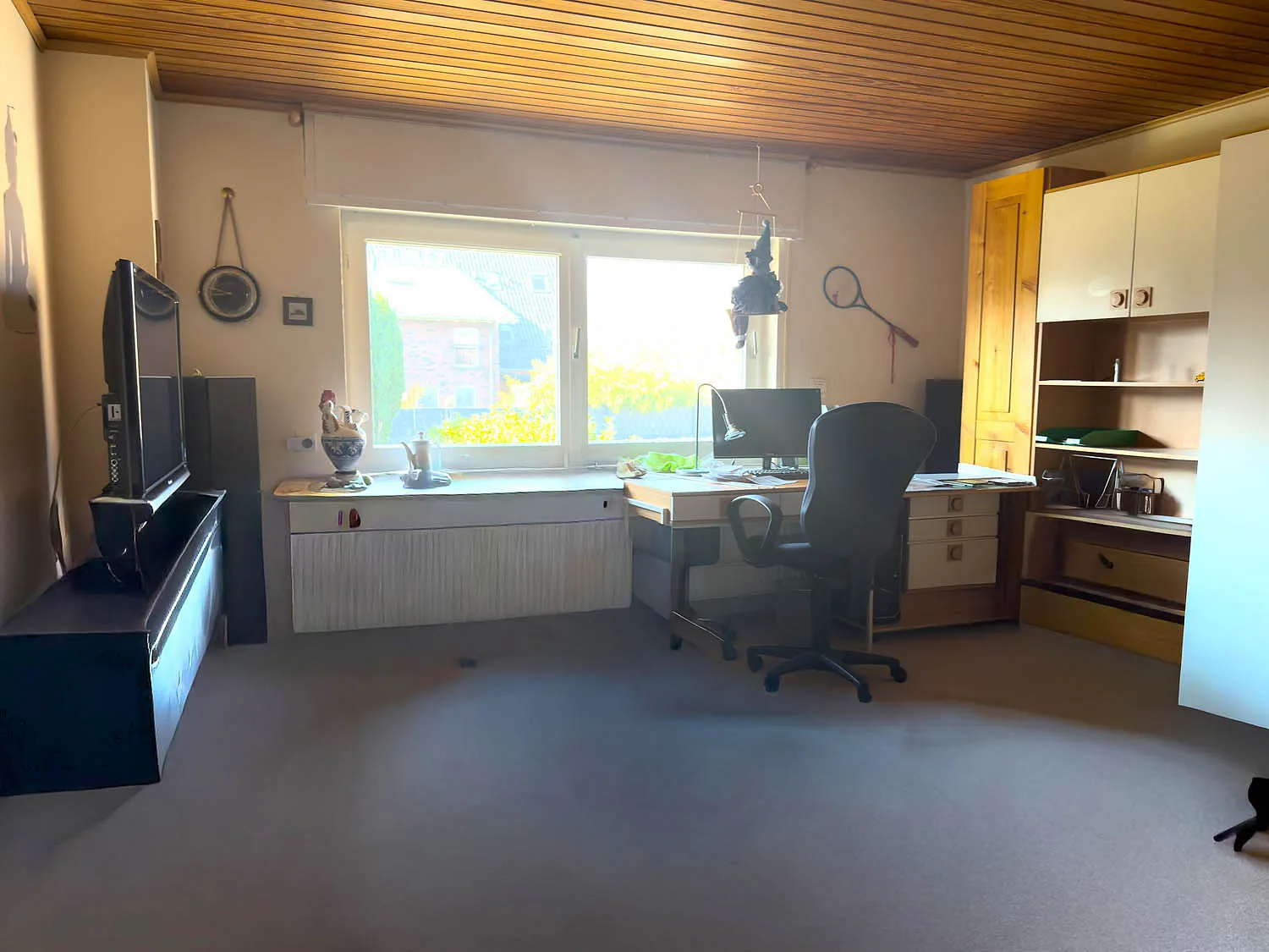 Ein besonderes Extra ist die Erweiterung aus dem Jahr 1971: Über der Garage wurden zusätzliche ca. 26 m² Wohnfläche geschaffen. Dieser Bereich ist über eine separate Treppe aus der Diele erreichbar und eignet sich hervorragend als Rückzugsort, Gästebereich oder für größere Kinder. Hier stehen Ihnen ein Schlafzimmer sowie ein WC mit Waschtisch zur Verfügung – der Einbau einer Dusche ist möglich.