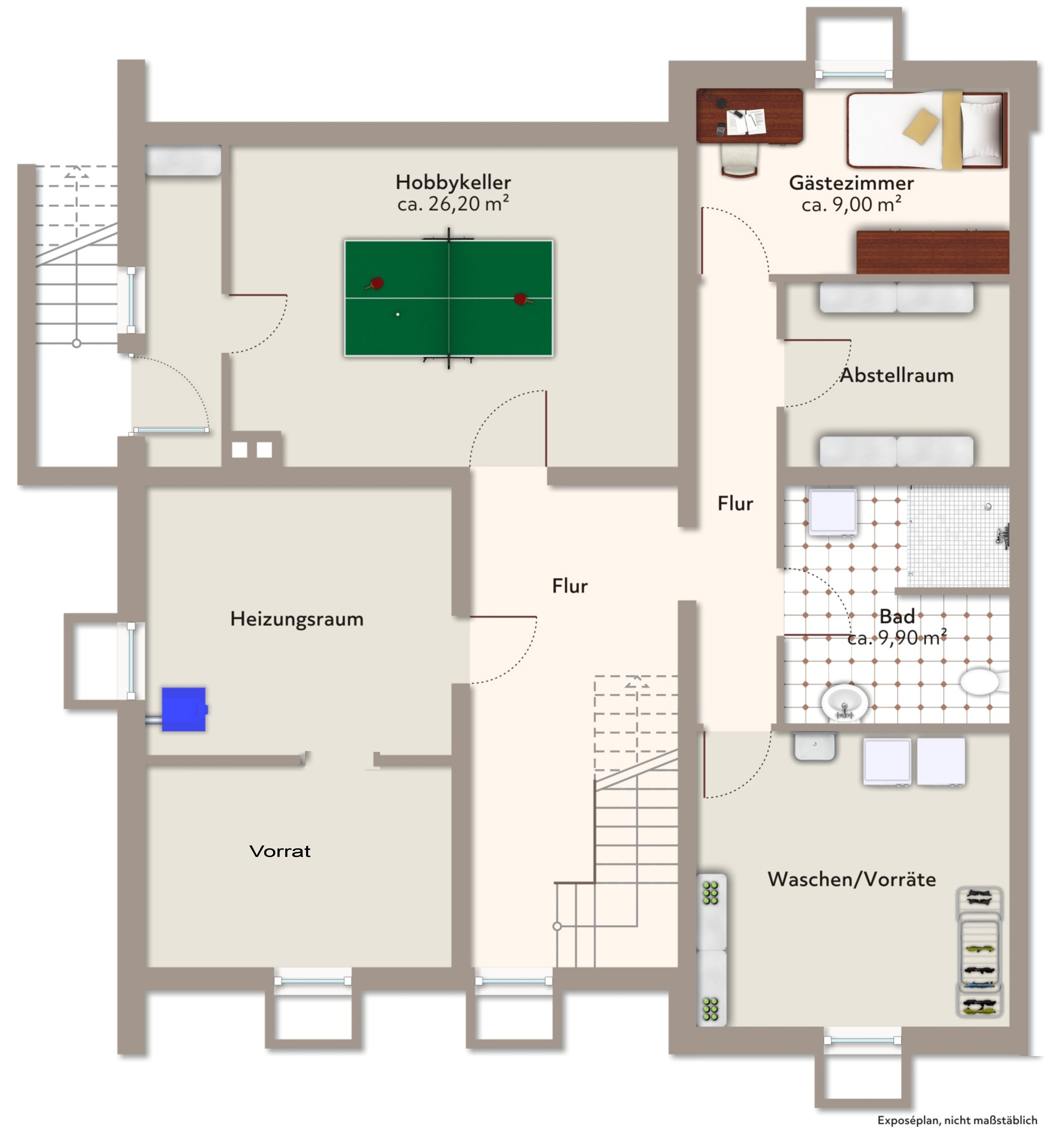 Das Haus ist vollständig unterkellert und bietet zusätzlichen Wohn- und Nutzraum. Ein Gästezimmer sowie ein vollwertiges Badezimmer mit Dusche und WC schaffen flexible Nutzungsmöglichkeiten. Darüber hinaus stehen ein Waschkeller, ein großzügiger Hobbyraum und ein Heizungsraum zur Verfügung.
