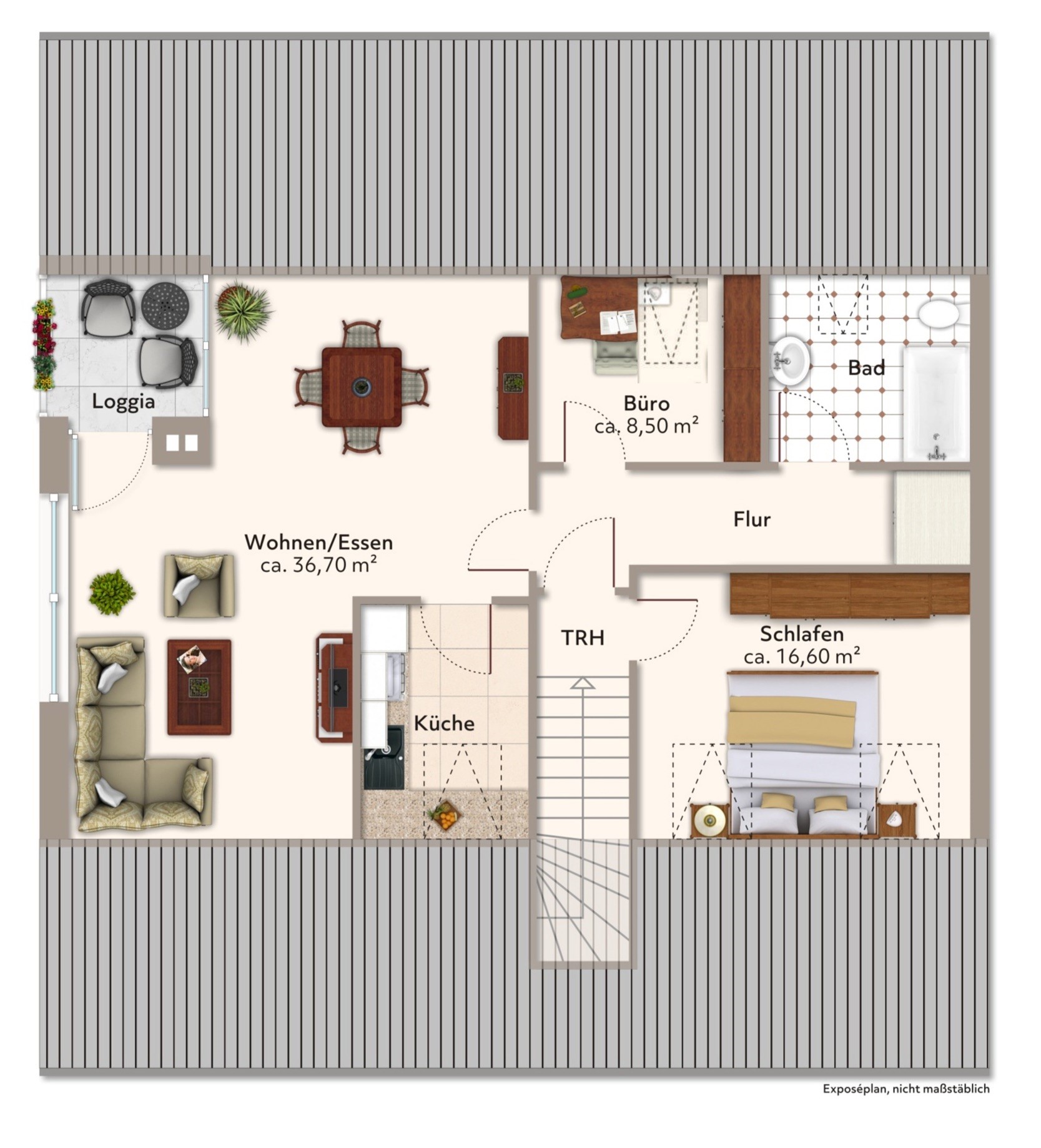 Im Obergeschoss eröffnen sich weitere Möglichkeiten: Hier stehen ca. 85 m² zur Verfügung, die sich ideal als Einliegerwohnung oder separater Wohnbereich nutzen lassen. Neben zwei Zimmern (ca. 8,5 m² und 16 m²) gibt es einen großzügigen und hellen Wohn- und Essbereich mit über 36 m², eine Küche, ein Badezimmer sowie eine schöne Loggia. Perfekt für Mehrgenerationenwohnen, erwachsene Kinder oder zur teilweisen Vermietung.