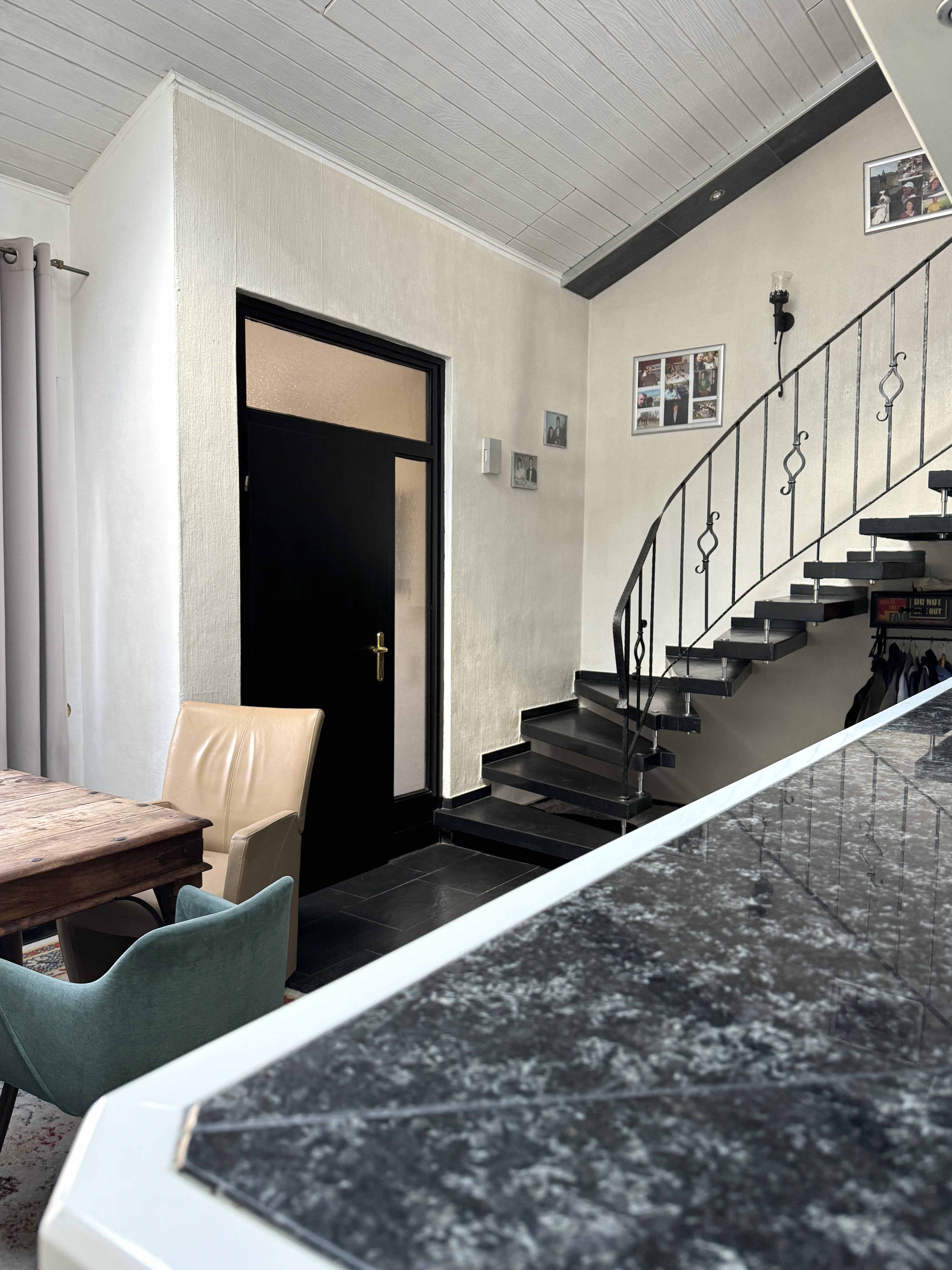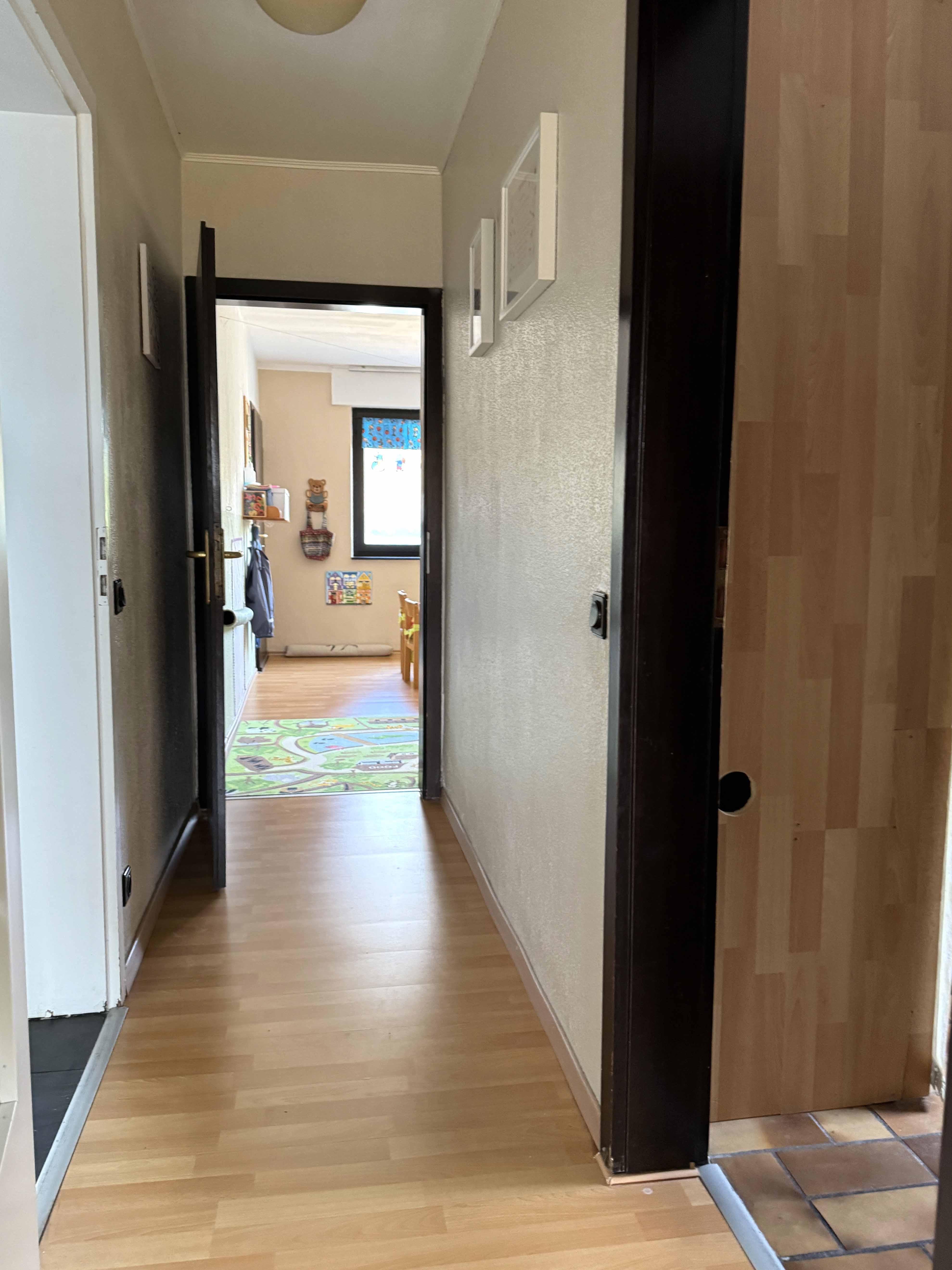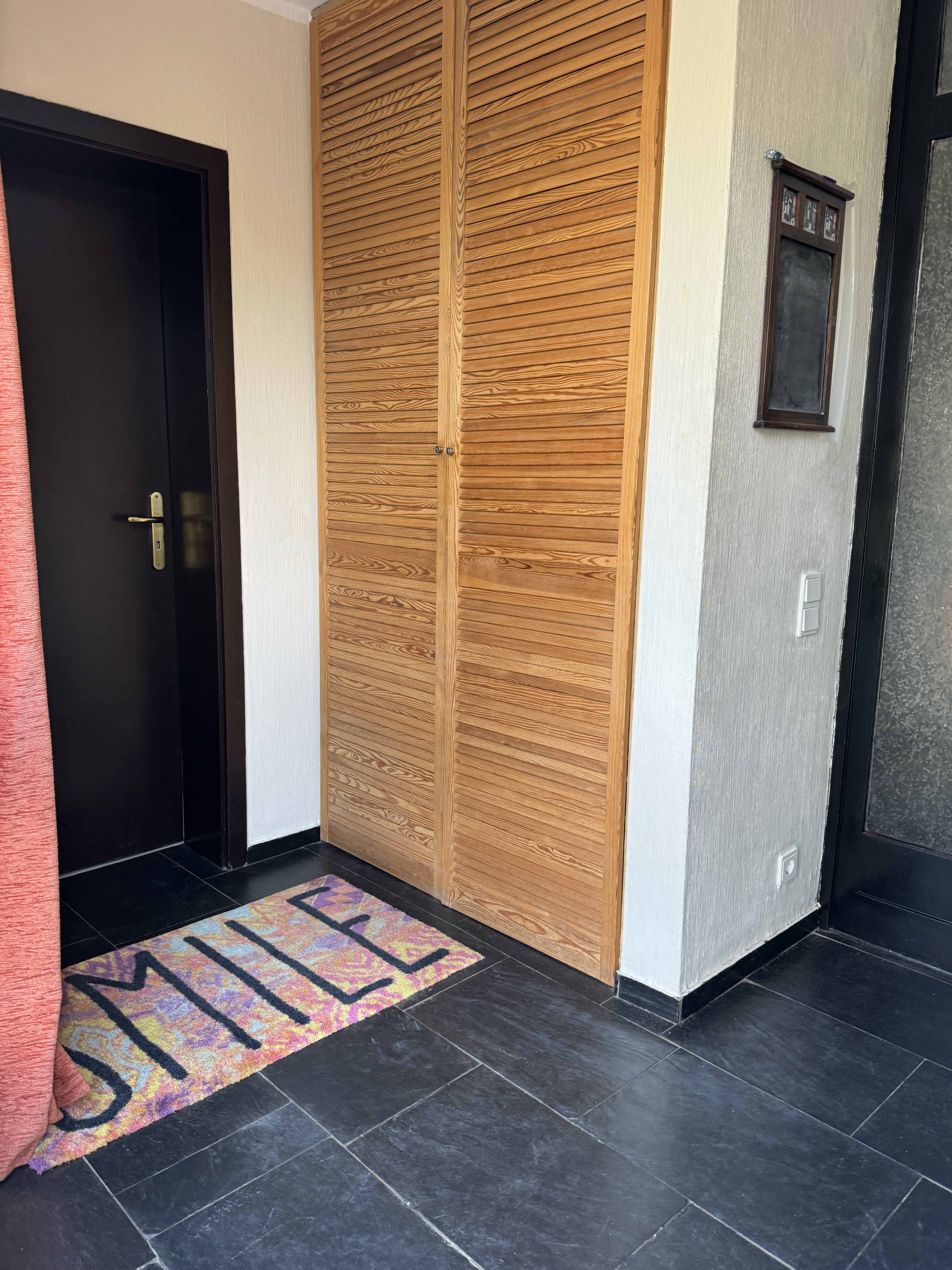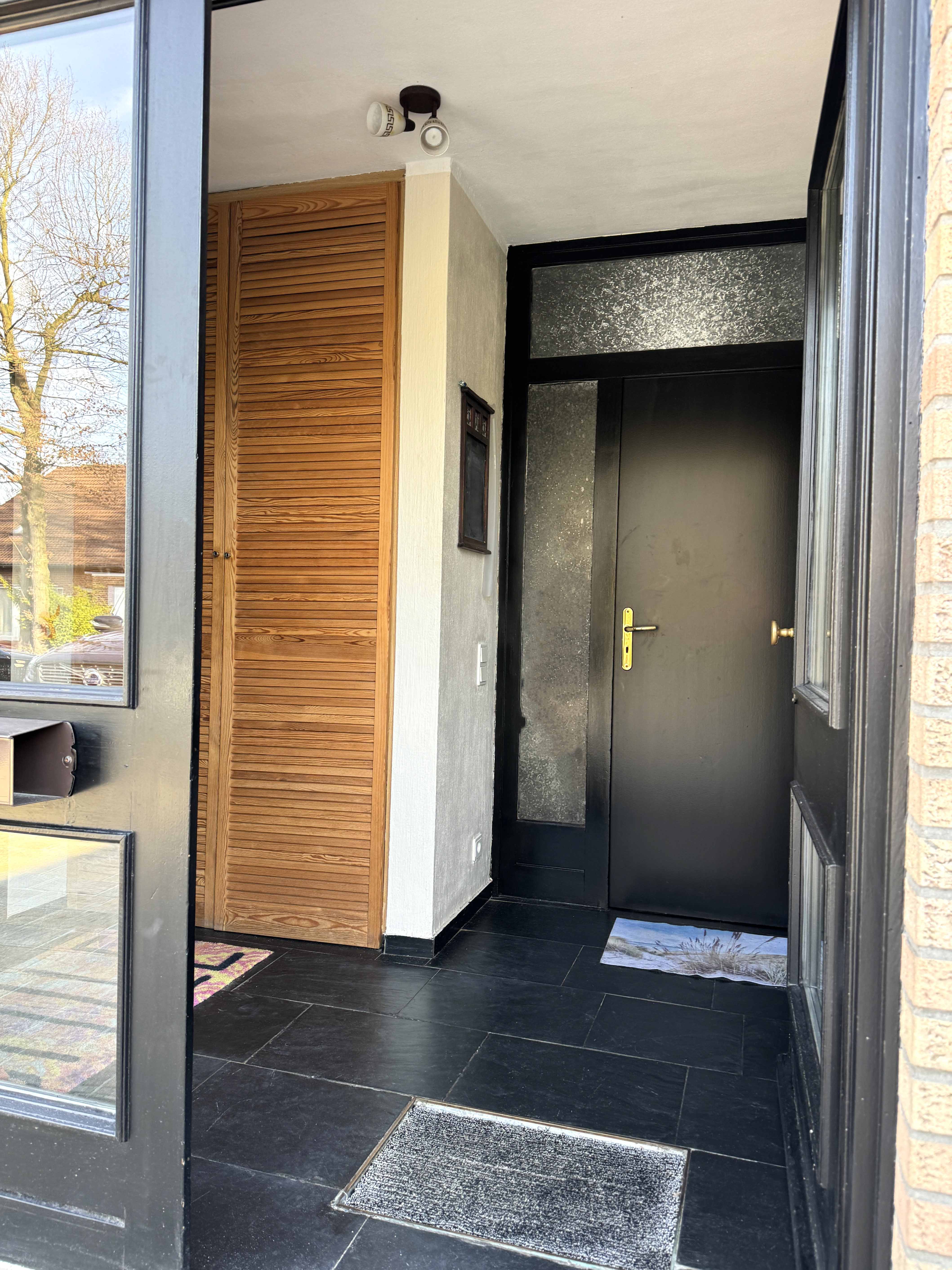 Kommen Sie wir schauen uns das top gepflegte Haus aus dem Baujahr 1981 einmal von innen an. Wir betreten die Haustür und stehen im großzügigen Windfang. Hier gibt es einen geräumigen Einbauschrank und außerdem genug Platz für die Schuhe und auch das Bobby Car.