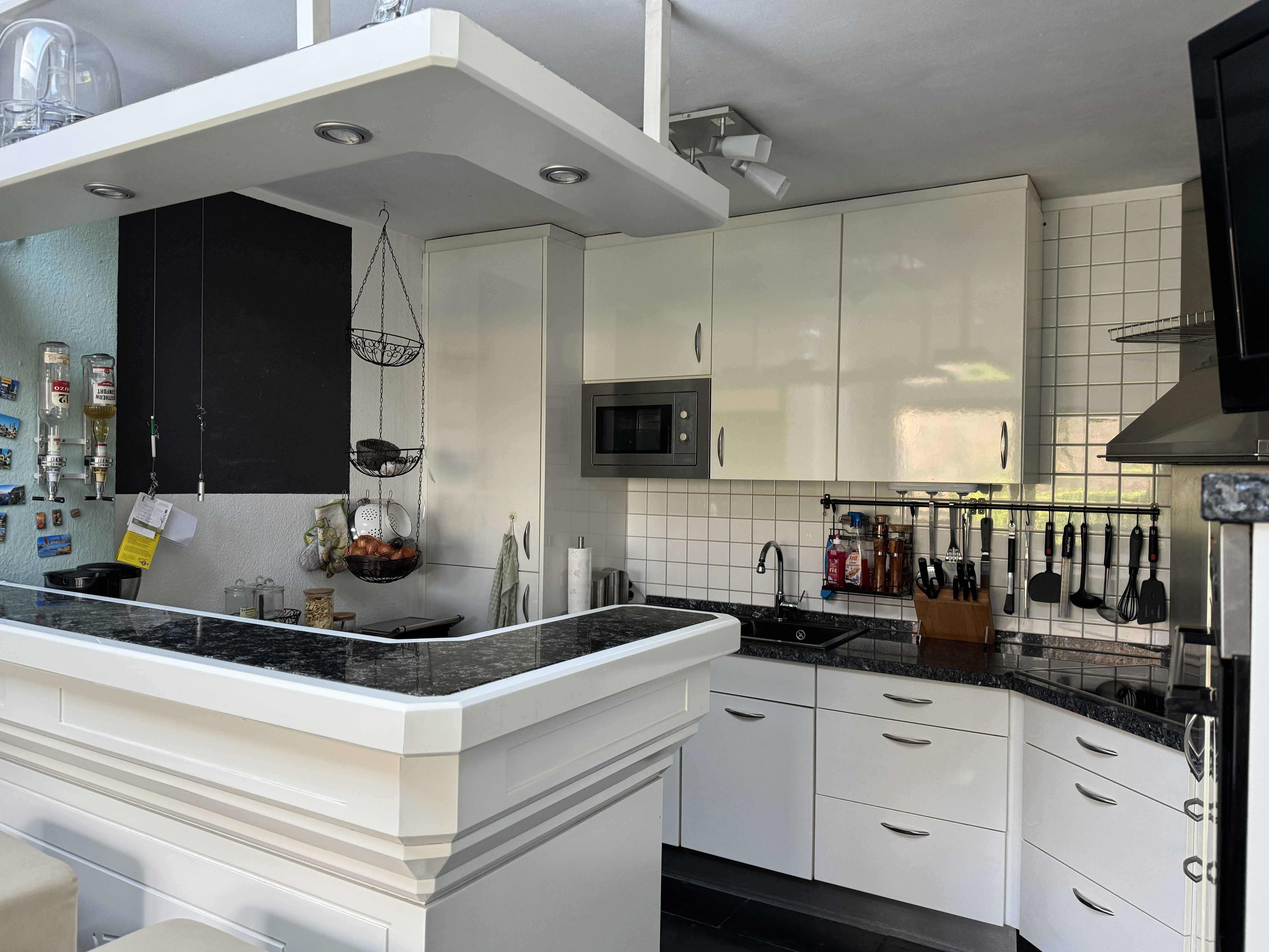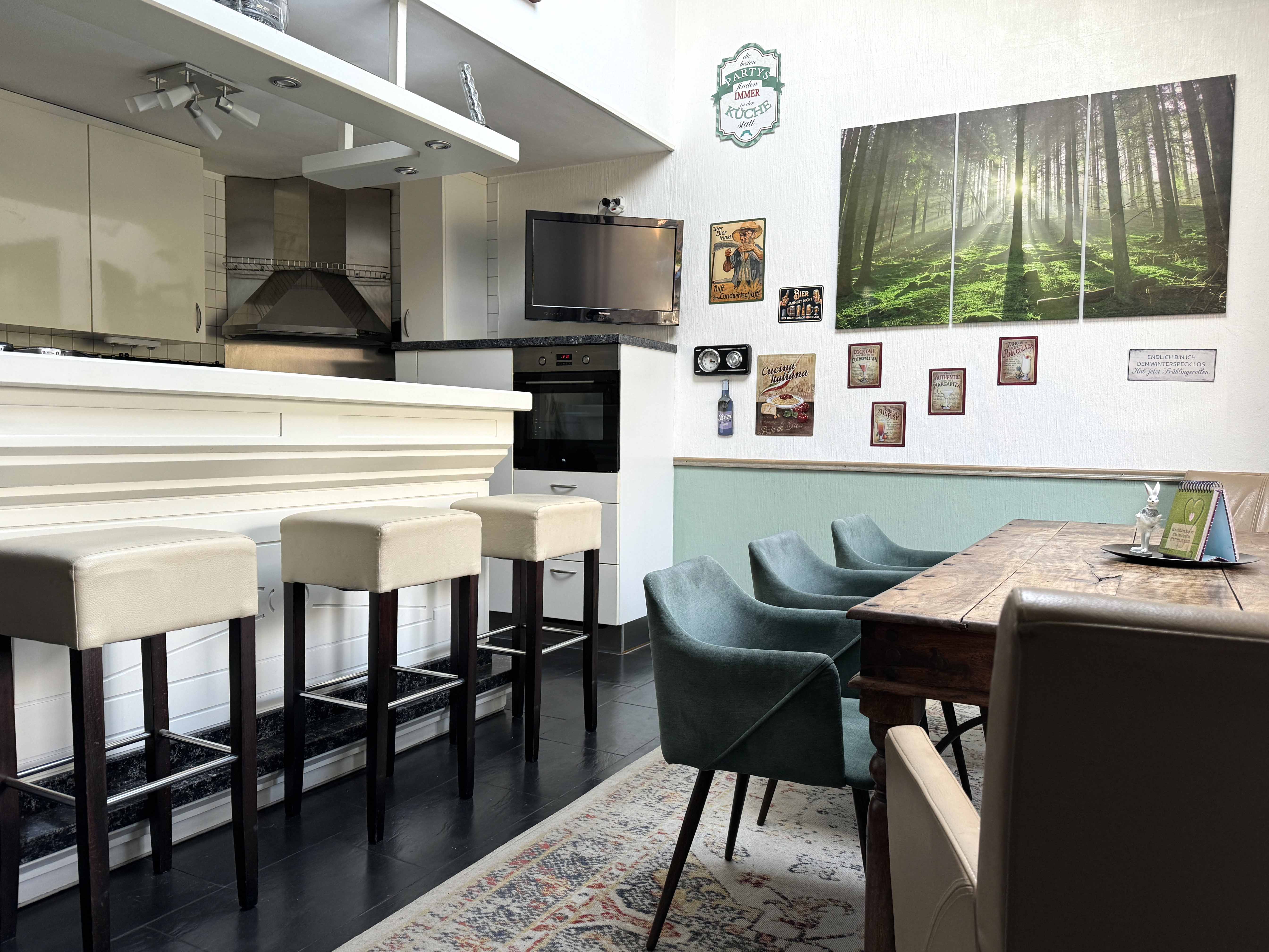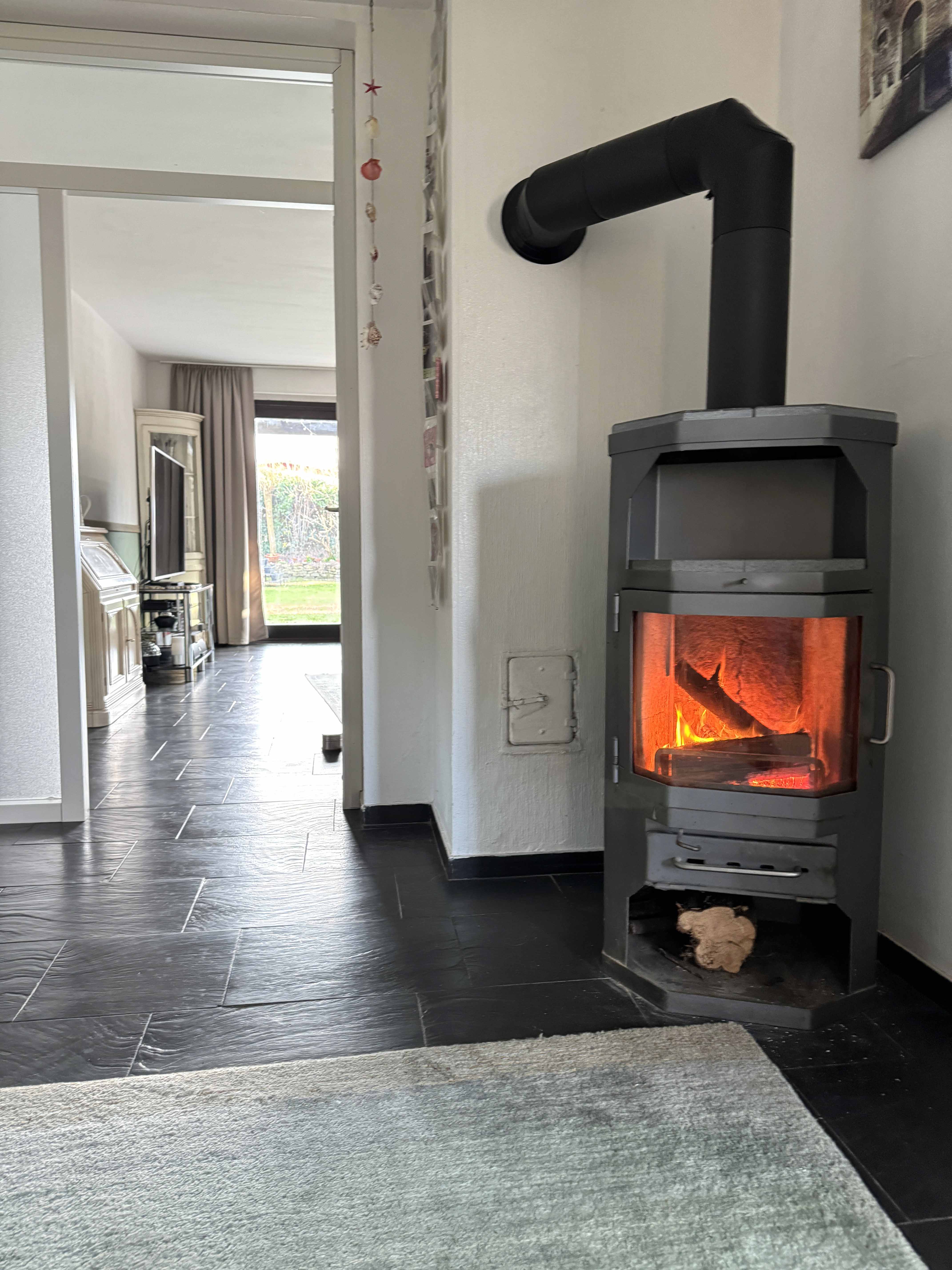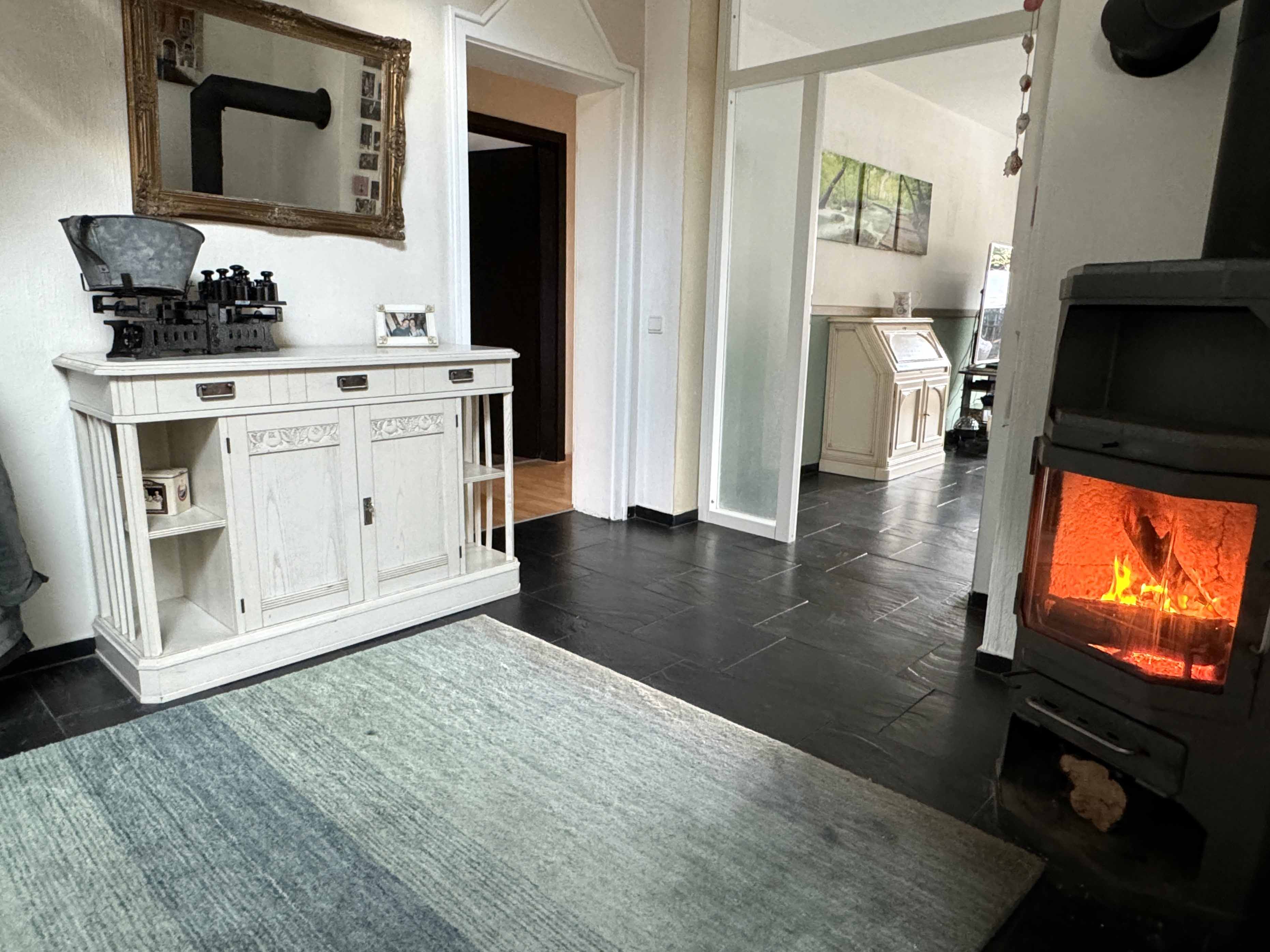 Nun gehen wir durch die Wohnungstür und stehen in der Diele mit angrenzender Küche und dem Essbereich. Hier lodert ein Kaminofen. Das gibt schöne Wärme im ganzen Haus und spart Heizkosten. Der Essbereich, ist wie auch der Windfang und der Wohnbereich mit hochwertigen schwarzen Schieferfliesen ausgestattet. Das Haus verfügt in fast allen Räumen über eine Fußbodenheizung. In dem Esszimmer mit angrenzender Küche werden Sie sicher tolle Stunden mit der ganzen Familie verbringen. Die Küche ist komplett offen gestaltet, gern gesehen bei allen, die Kochen als gemeinsames Erlebnis zelebrieren. Geradeaus gehen wir in den Wohnbereich mit ca. 35 m². Hier gibt es einen zweiten aufgemauerten Kamin und viel Platz für eine große Sofaecke und Ihren Fernseher. Im Wohnzimmer gibt es große Fenster, die für reichlich Tageslicht sorgen. Durch eine Glastür geht es direkt auf die überdachte Terrasse.