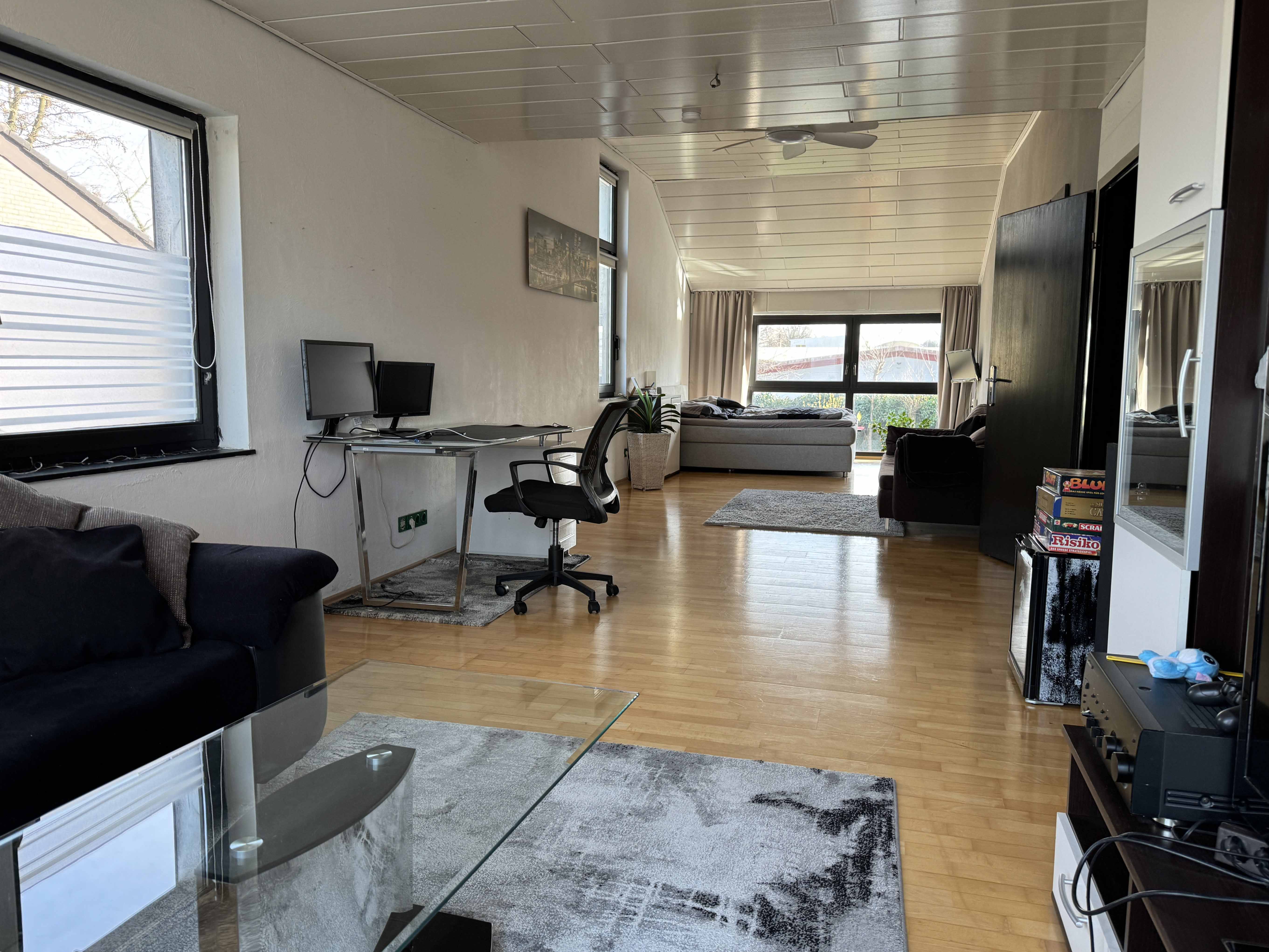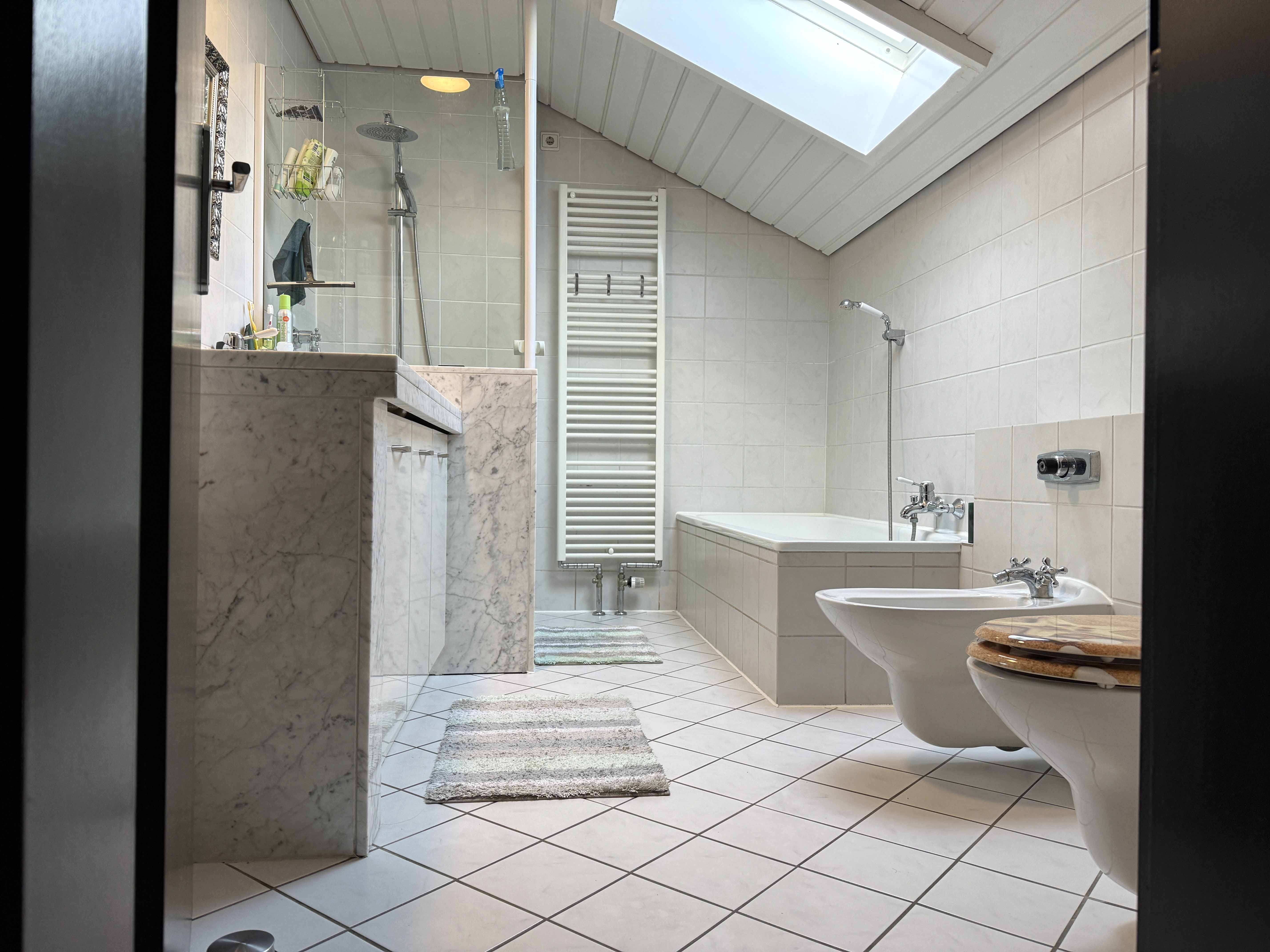 Gehen wir nun die Treppe ins erste Obergeschoss, so liegt geradeaus das Badezimmer mit Dusche und Badewanne. Mit hellem Marmor und weißen Fliesen ist es zeitlos gestaltet. Der Raum rechts daneben könnte das Elternschlafzimmer werden. Ein großes helles ca. 20 m² Zimmer mit Glastür zur ca. 6 m² großen Loggia. Daneben liegt ein weiteres Zimmer. Mit seinen ca.11,5 m² wird es vielleicht ihr neues Büro. Auch von dort führt eine Tür auf die Loggia mit tollem Blick in Ihren grünen Garten. Durch die linke Tür betreten wir das Highlight des Hauses, dort wurde 1996 der Dachboden zum Studio ausgebaut. Hier sind ca. 39 m² Wohnfläche entstanden, für die Sie sicher Ihre ganz eigenen Ideen haben.