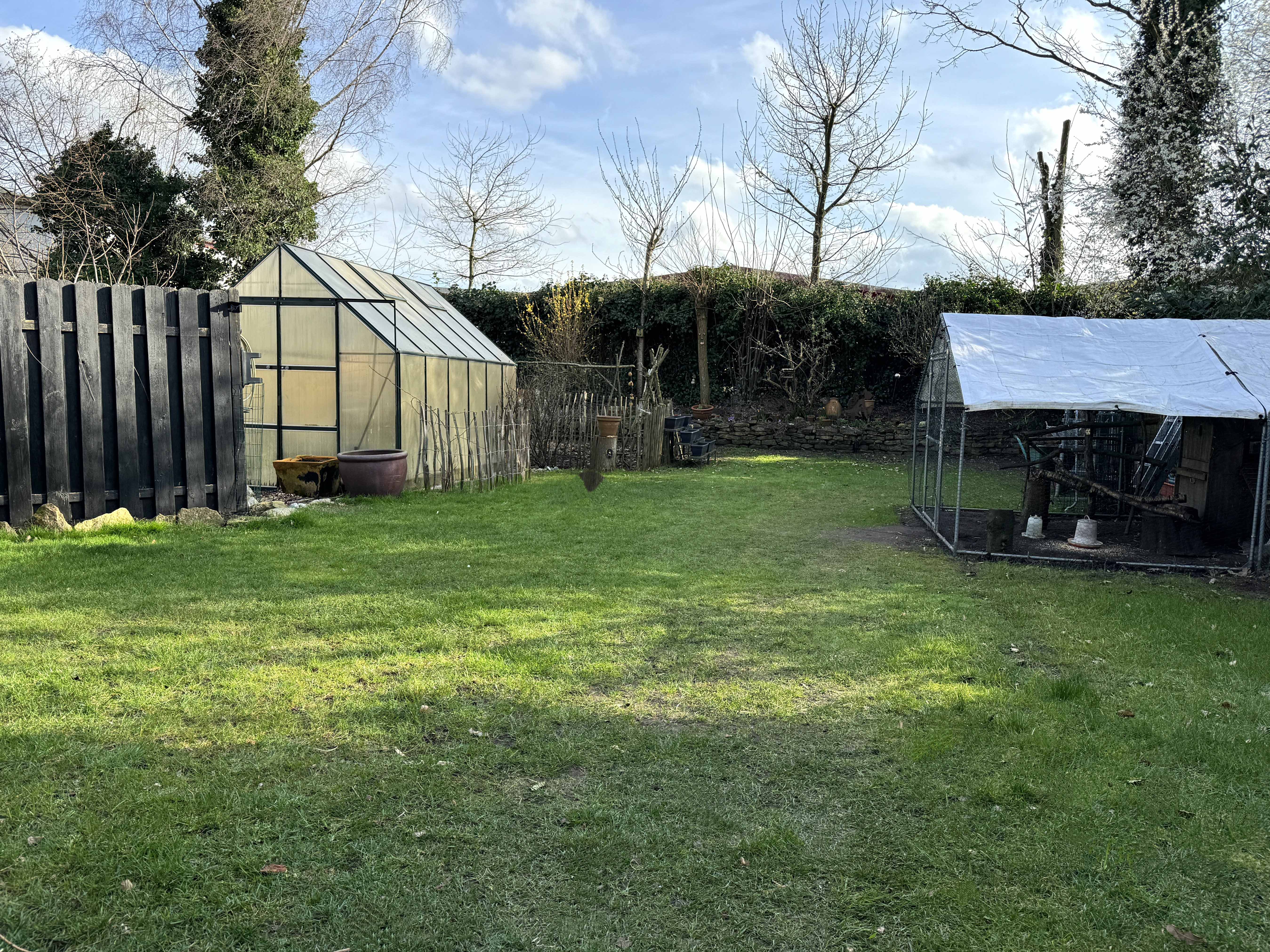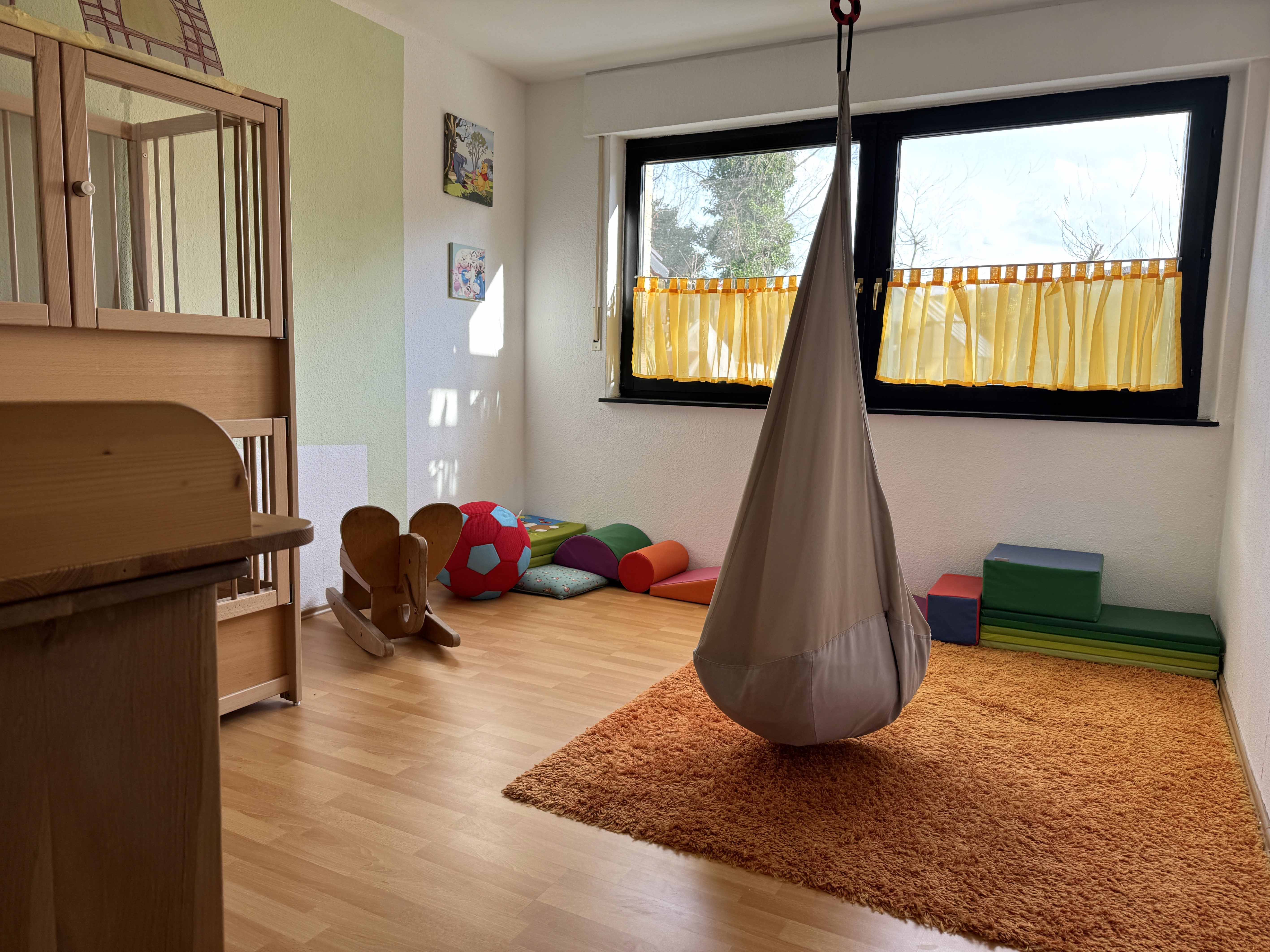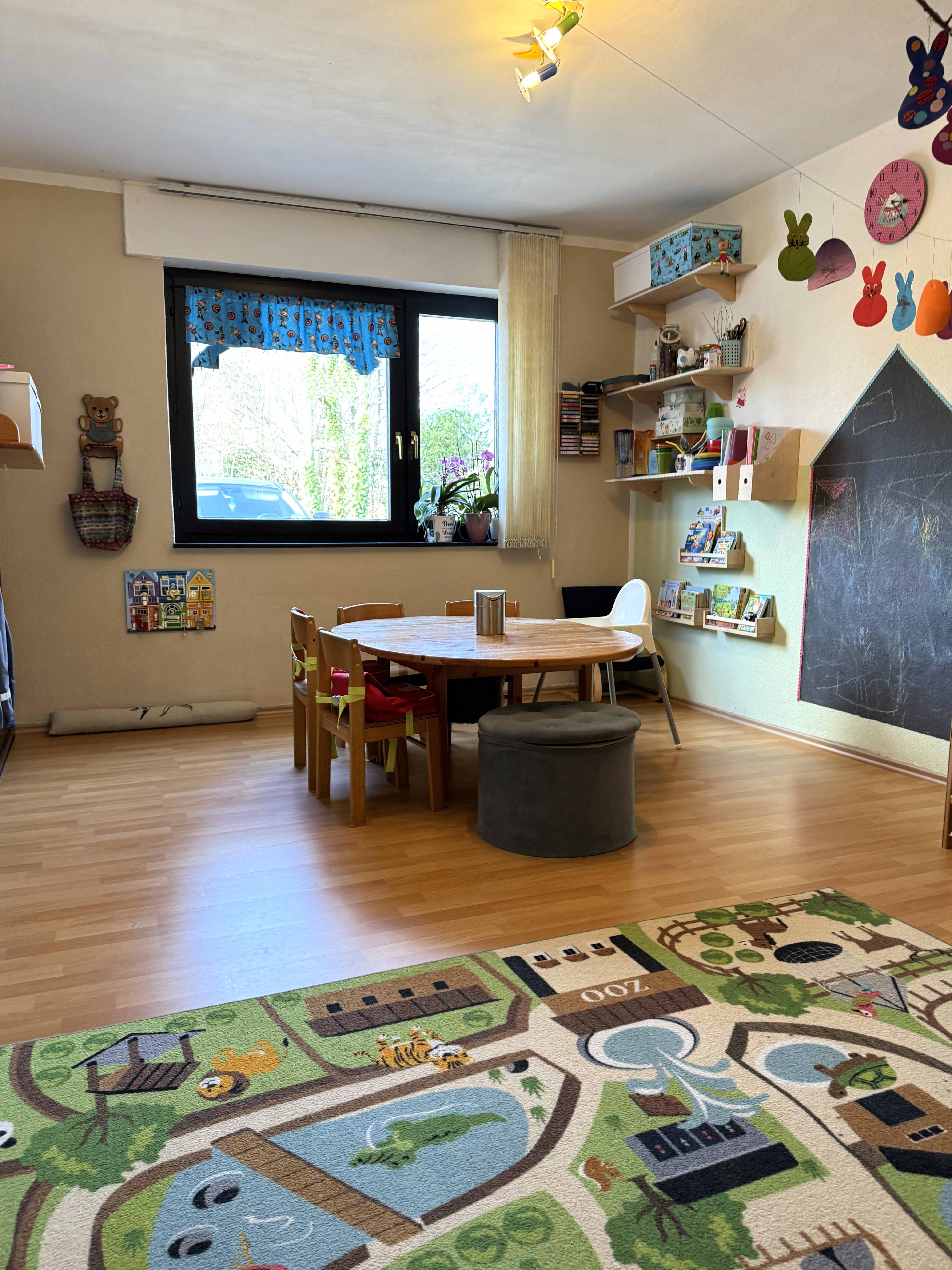 Von dort lassen wir den Blick in den Garten schweifen. Dieser ist derzeit pflegeleicht mit viel Rasenfläche angelegt. Ein Gewächshaus und eine Gartenhütte stehen hier. Und sicher finden bei Bedarf eine Schaukel oder ein Sandkasten noch Platz. Ein Seitengang neben dem Haus führt direkt in die Garage und auch in den Hauswirtschaftsraum. Das ist praktisch. Zurück im Haus laufen wir rechts, etwas abgetrennt von dem Rest der Wohnung in den Teil, der zurzeit gewerblich genutzt wird. Hier betreut die Eigentümerin Kinder als Tagesmutter. Es gibt zwei Zimmer mit 13,5 m² und 15 m², den Hauswirtschaftsraum, mit Platz für Waschmaschine und Trockner und ein weiß gefliestes WC mit Tageslichtfenster. Natürlich können die Räume auch direkt wieder als Schlafräume für weitere Kinder oder als Büros für Home-Office genutzt werden.