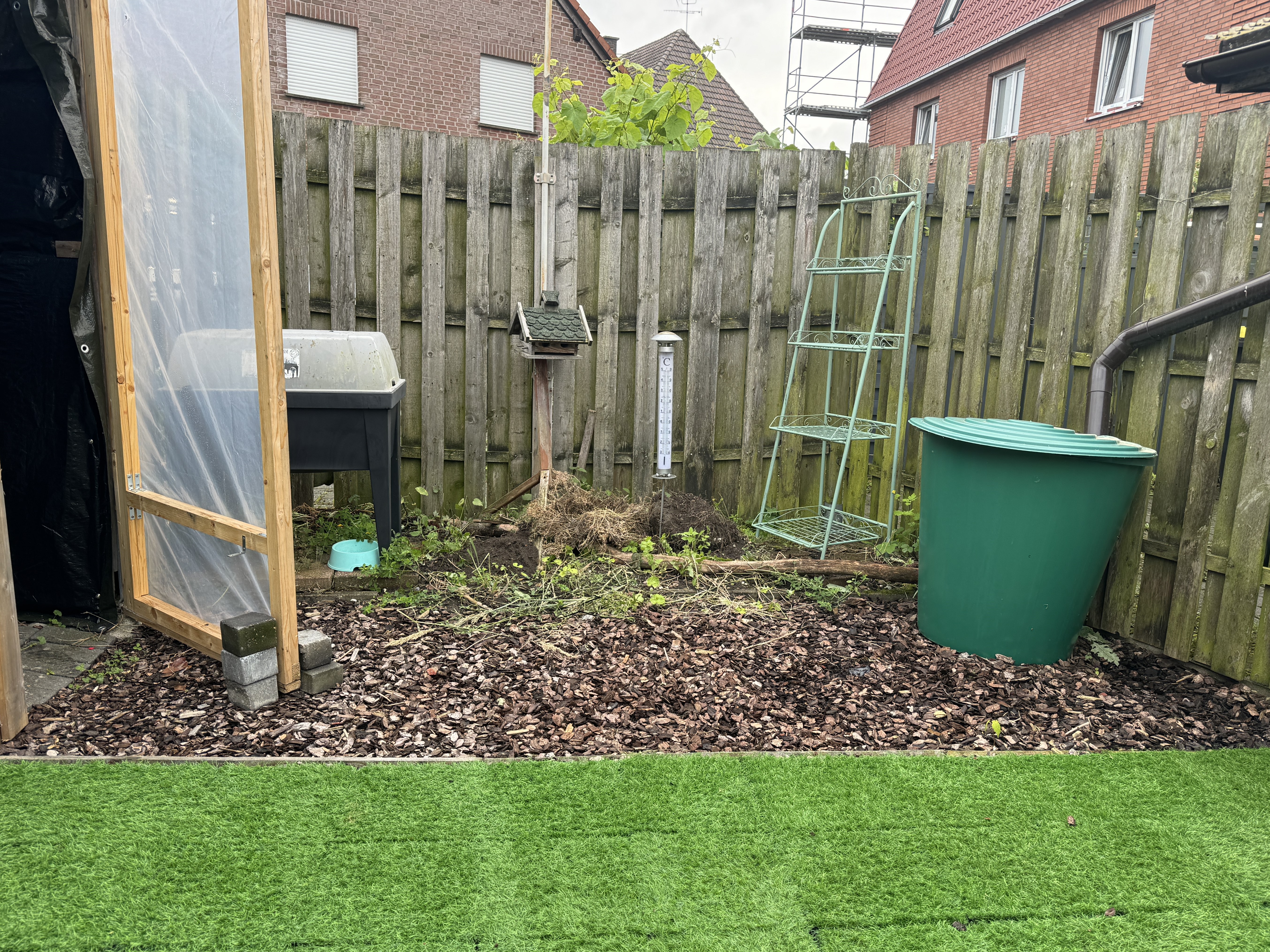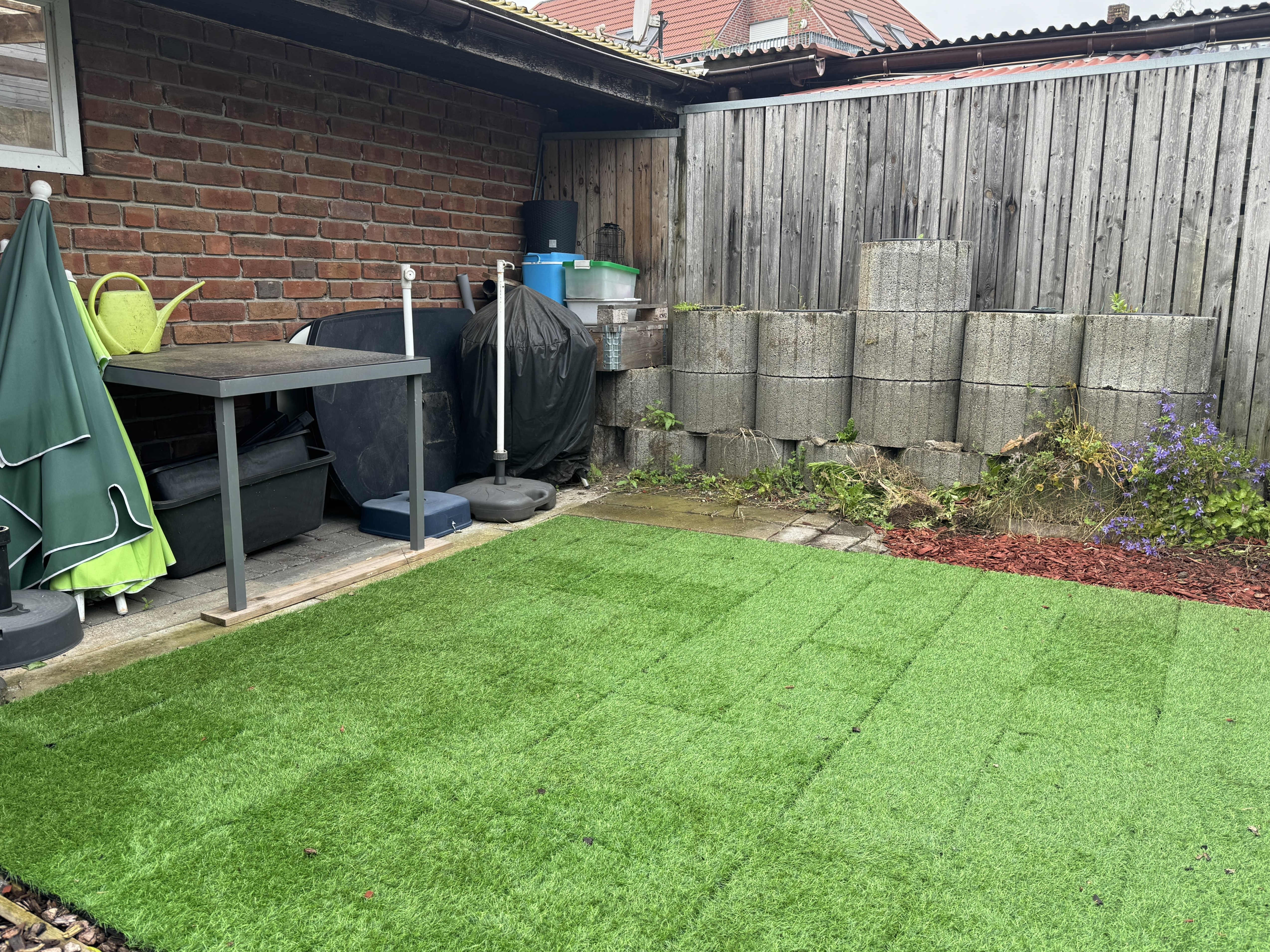 Mit Phantasie, Rasen, Blumen, Gartenmöbel und Sonne schaffen Sie sich ein kleines Schmuckstück: Ihren MINI-Garten! Aktuell ist ein Teil überdacht für Fahrräder und Gartenmöbel. Direkt daneben liegt Ihr persönlicher PKW-Stellplatz. Der Außenbereich liegt schön ruhig und sonnig hinter dem Gebäude.
