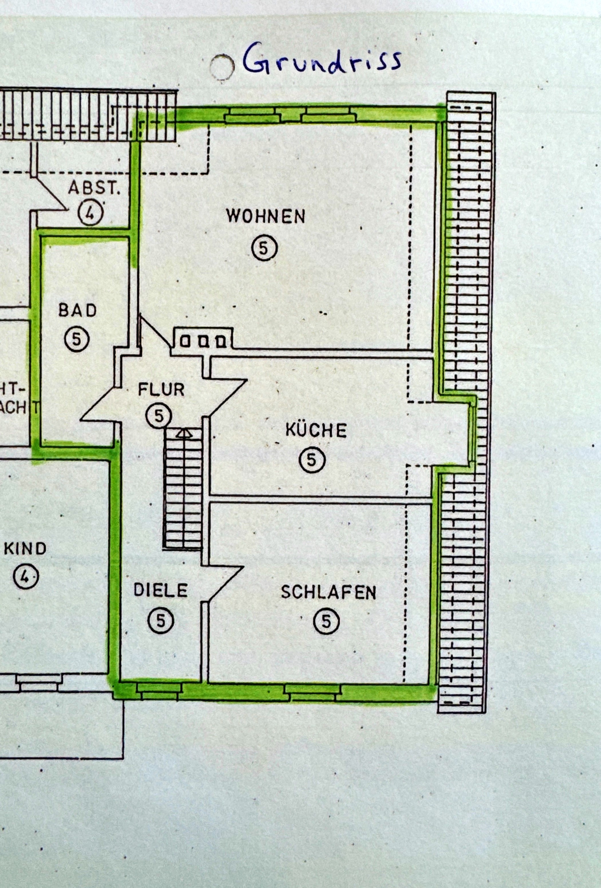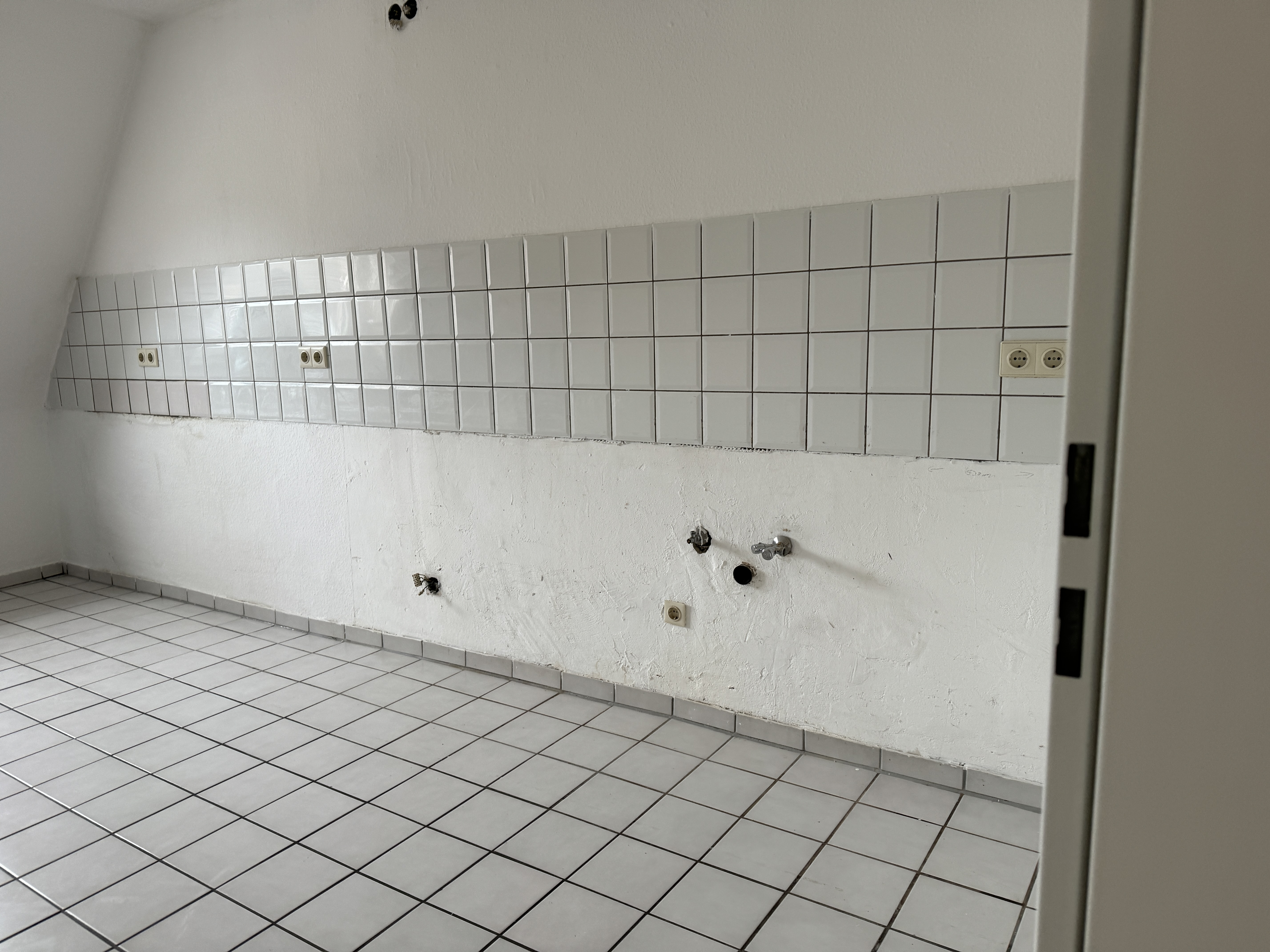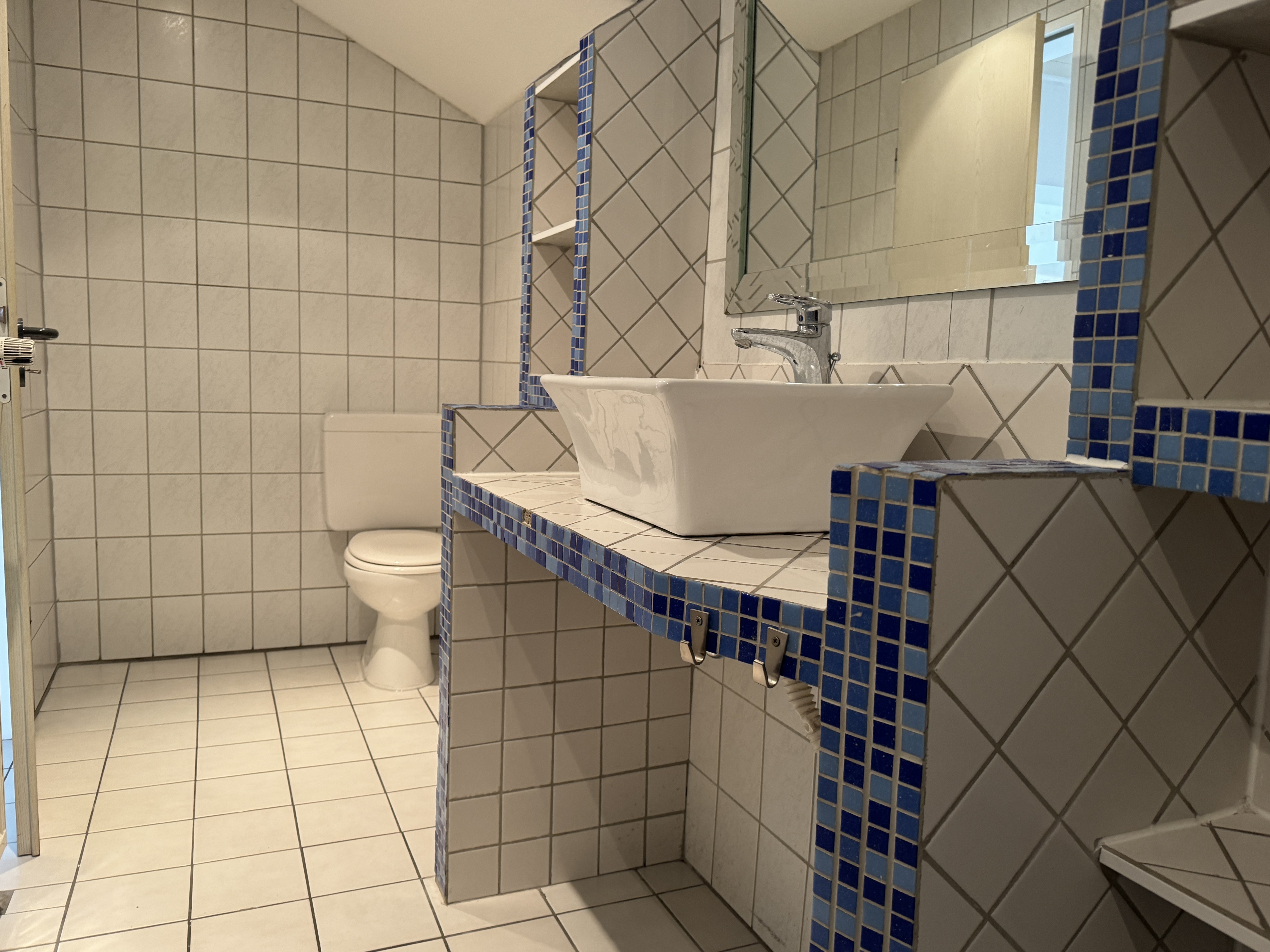 An den weißen Boden-Fliesen in der Diele, der Küche und dem Bad erkennt man den Stil der 2000 Jahre, als das 5 Parteienhaus umgebaut wurde. Die gemütliche Küche bietet mit den 14 m² Platz für einen Esstisch für ca. 4 Personen. Das „fröhliche Bad“ mit blauem Mosaik, hat eine Badewanne und den Waschmaschinen-Anschluss. In dem 17 m² großen Schafzimmer steht das Bett unter einer kleinen Schräge und hat viel Platz für einen großen Kleiderschrank und weitere Möbel.