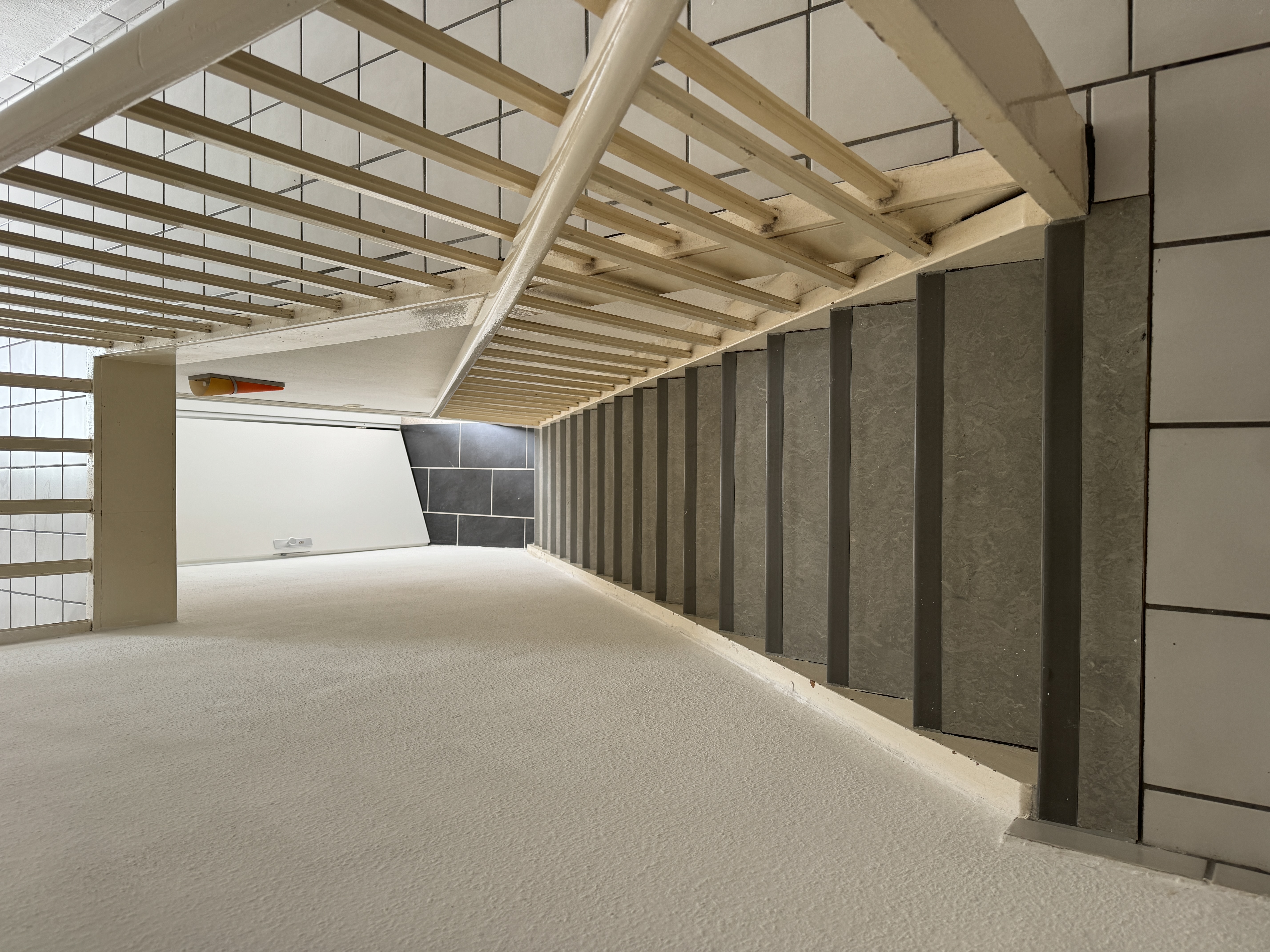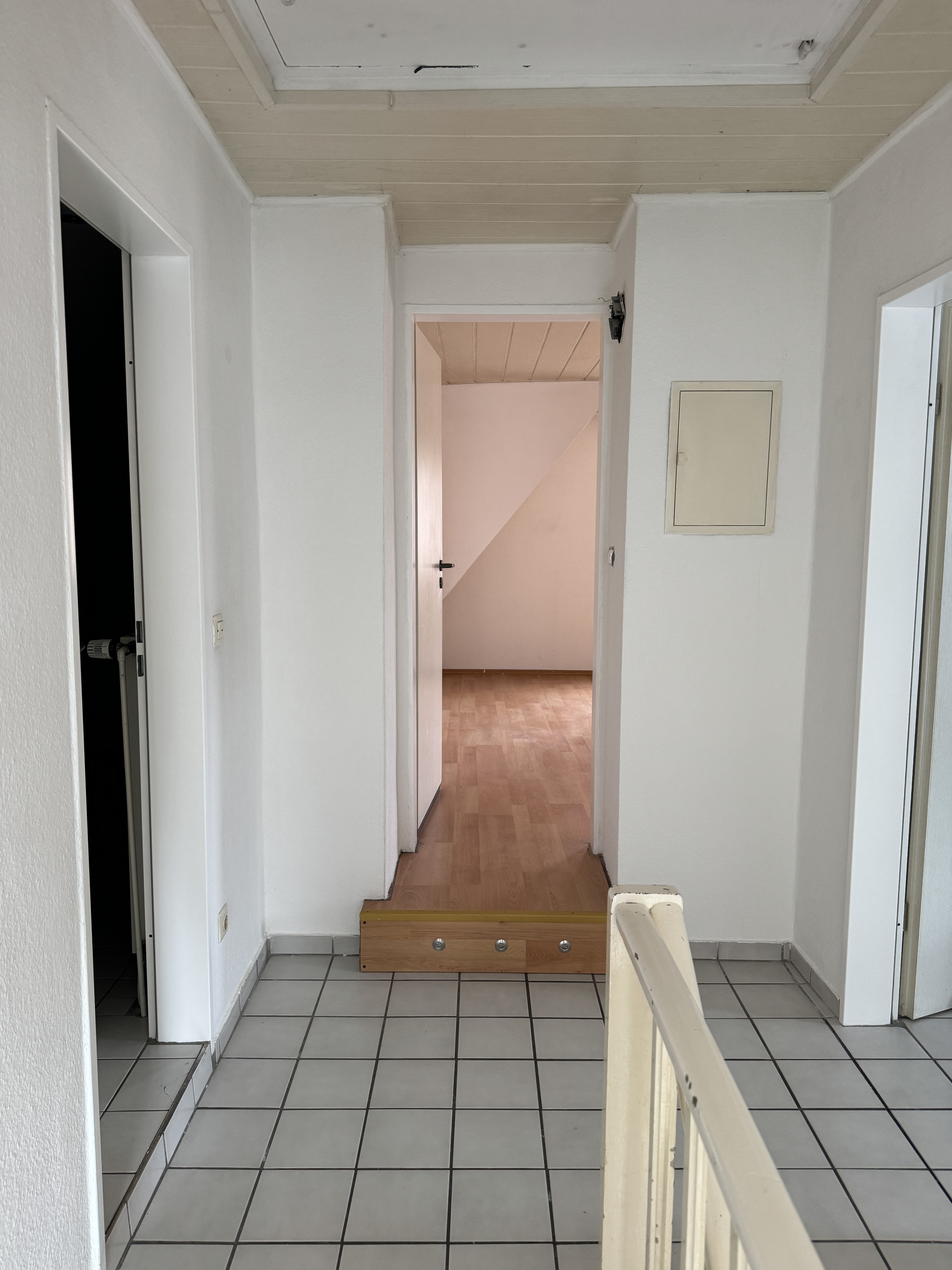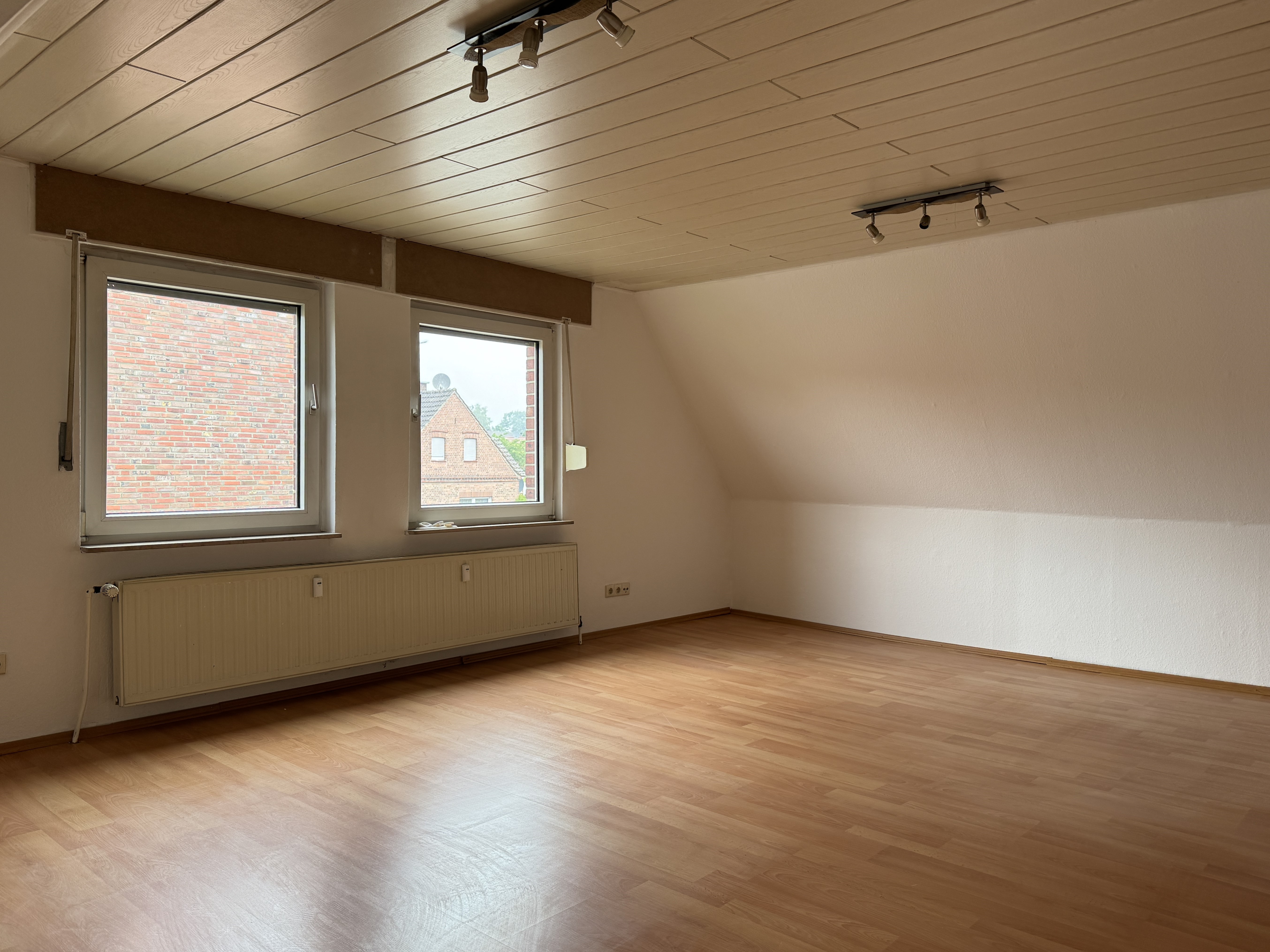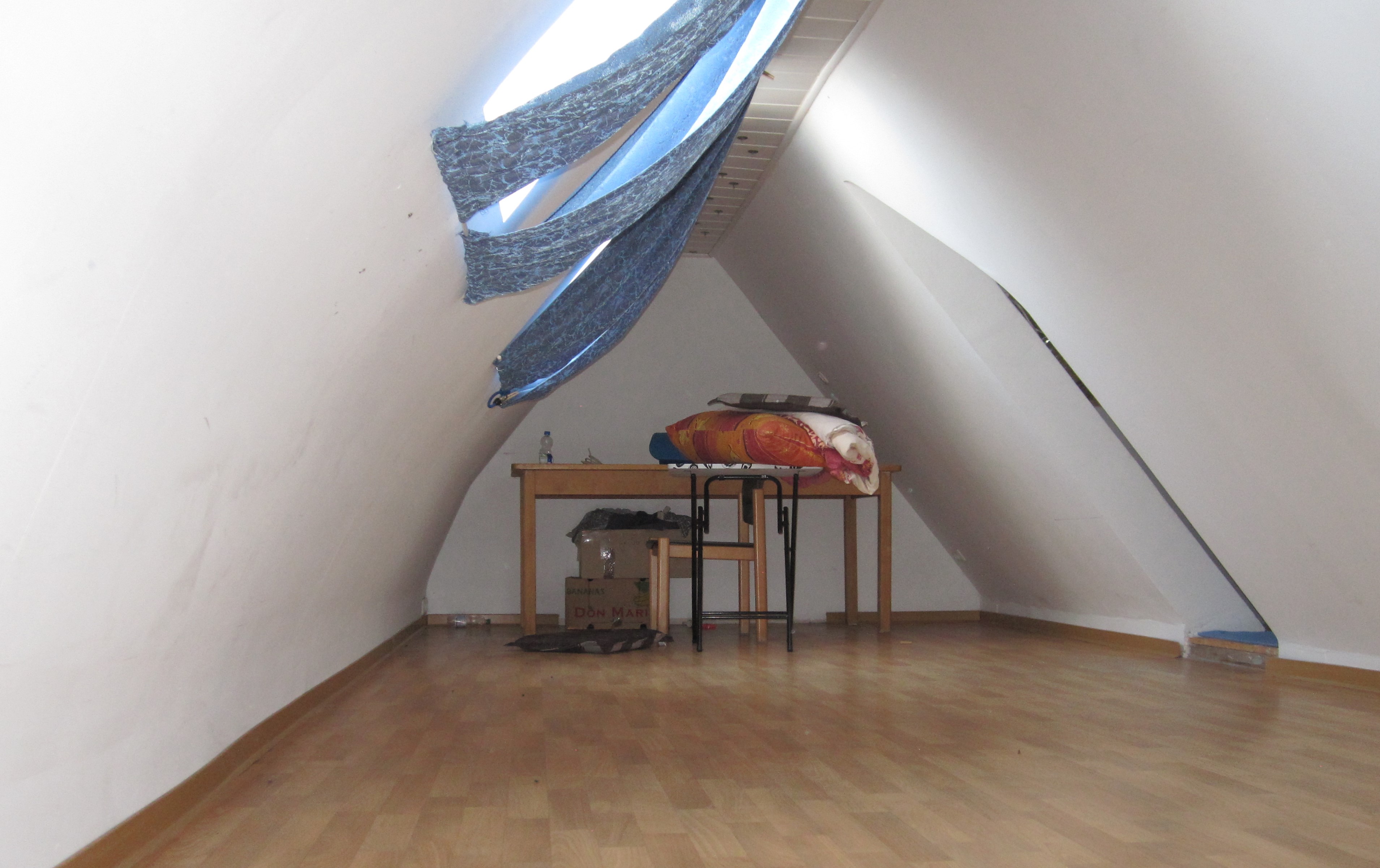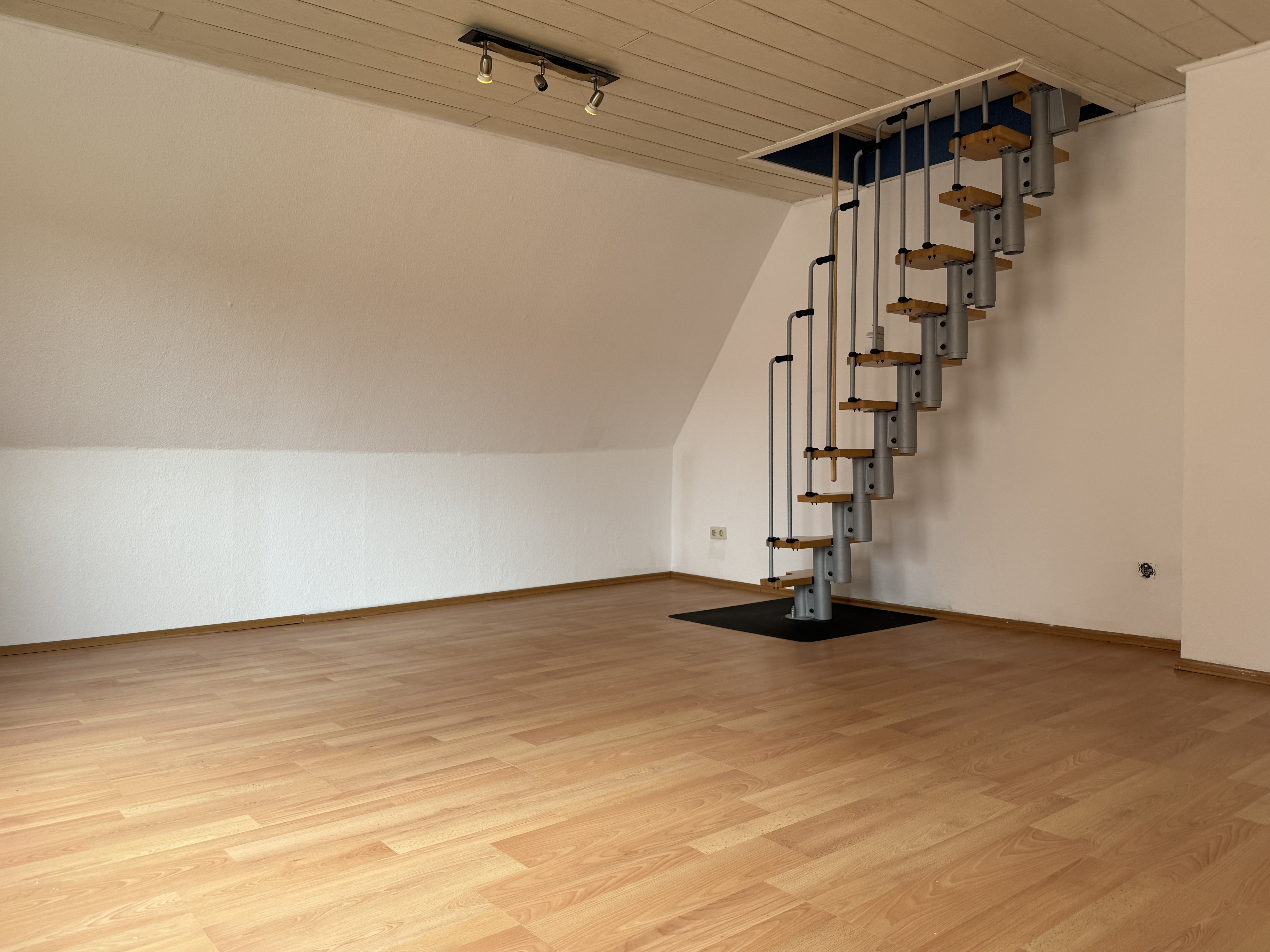 Der Charme aus den 30 Jahren ist zum Teil noch erkennbar und auch zu hören, wenn Sie über die steile Treppe zur Wohnung hinaufgehen und das Knatschen hören. Oben angekommen stehen wir in der offenen Galerie-Diele mit 4 Türen und einem schönen Fensterplatz als Lese-Ecke oder Schreibtisch-Arbeitsplatz. Diese Wohnung ist gemütlich und individuell. So führt uns eine beleuchtete Stufe in das 26 m² große Wohnzimmer. Durch den fast quadratischen Grundriss ist es prima zu möblieren. Ein schöner Blickfang im Wohnzimmer ist die Raumspartreppe, die an der gegenüberliegenden Wand der beiden Fenster steht. Die Treppe führt uns in das Mini-Dachstudio. Dieses ist ebenfalls mit Laminat in Buchenoptik ausgelegt und verfügt über 2 große Dachfenster in dem sehr schrägen Dach.