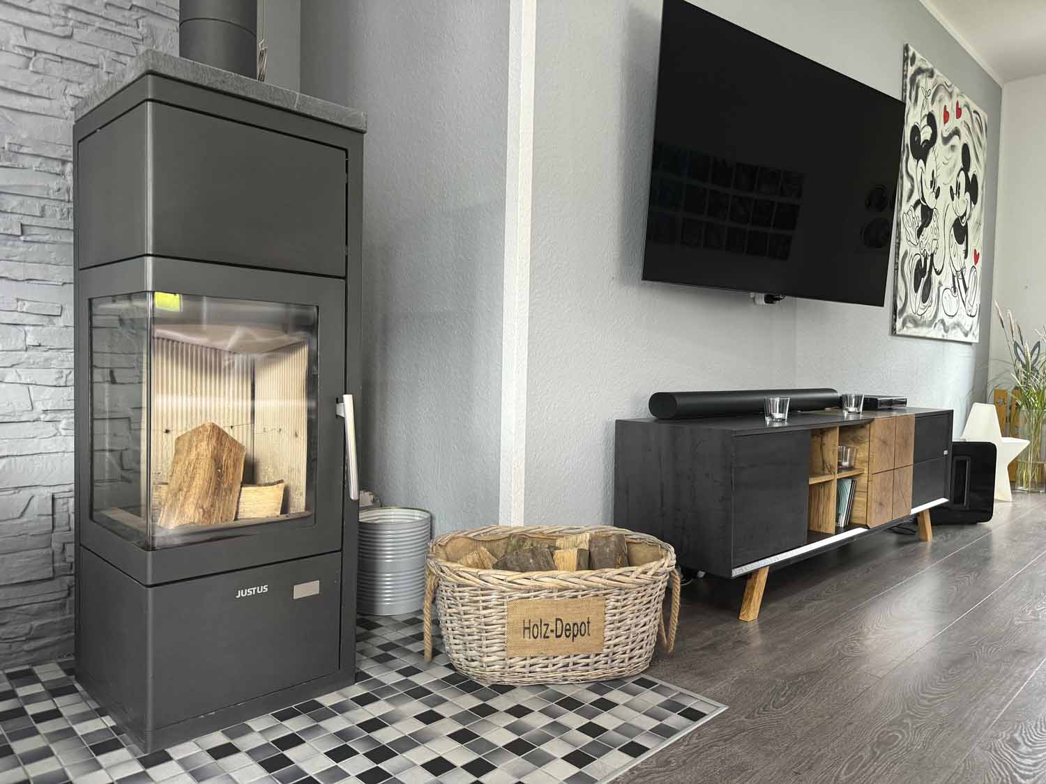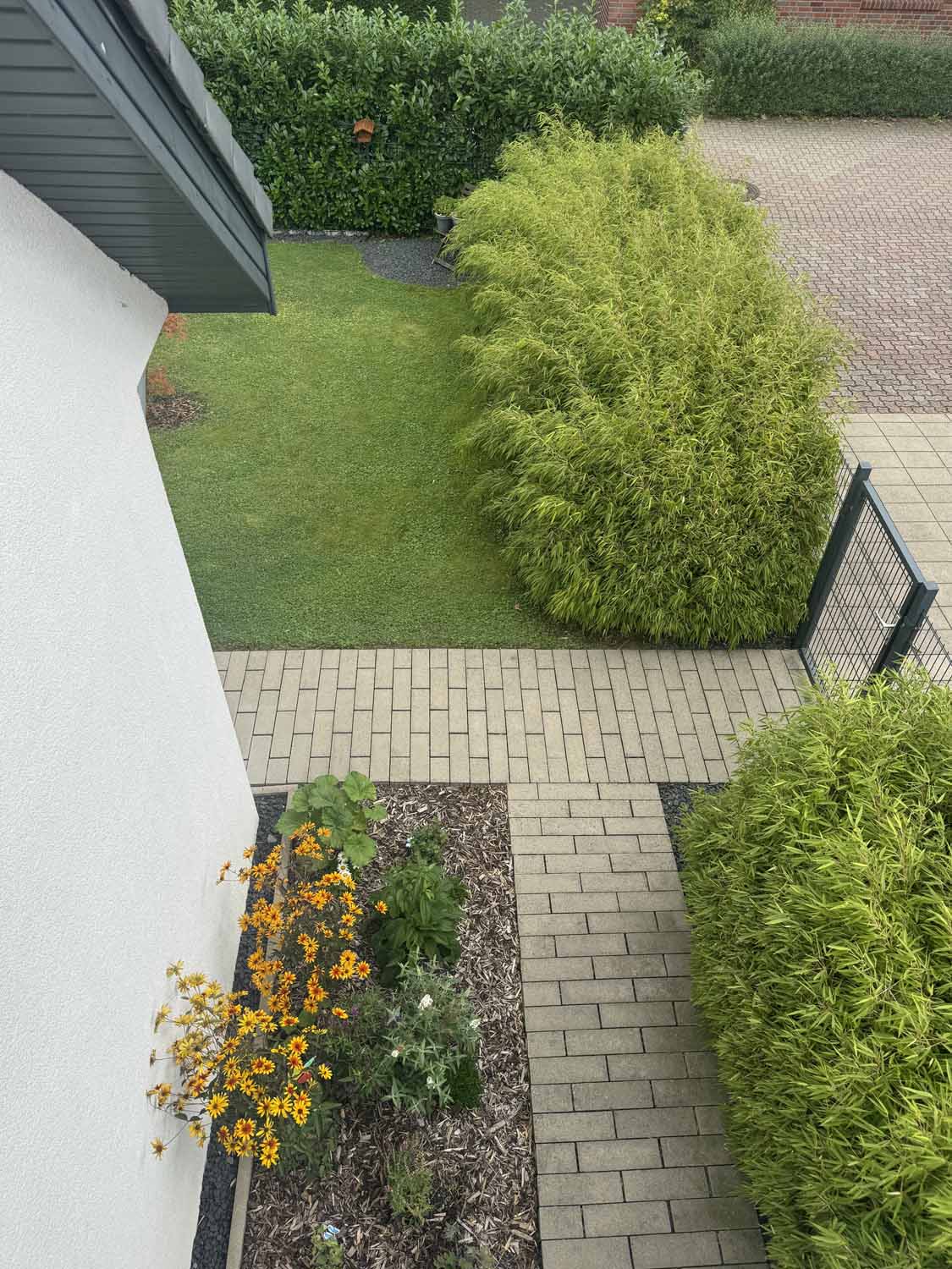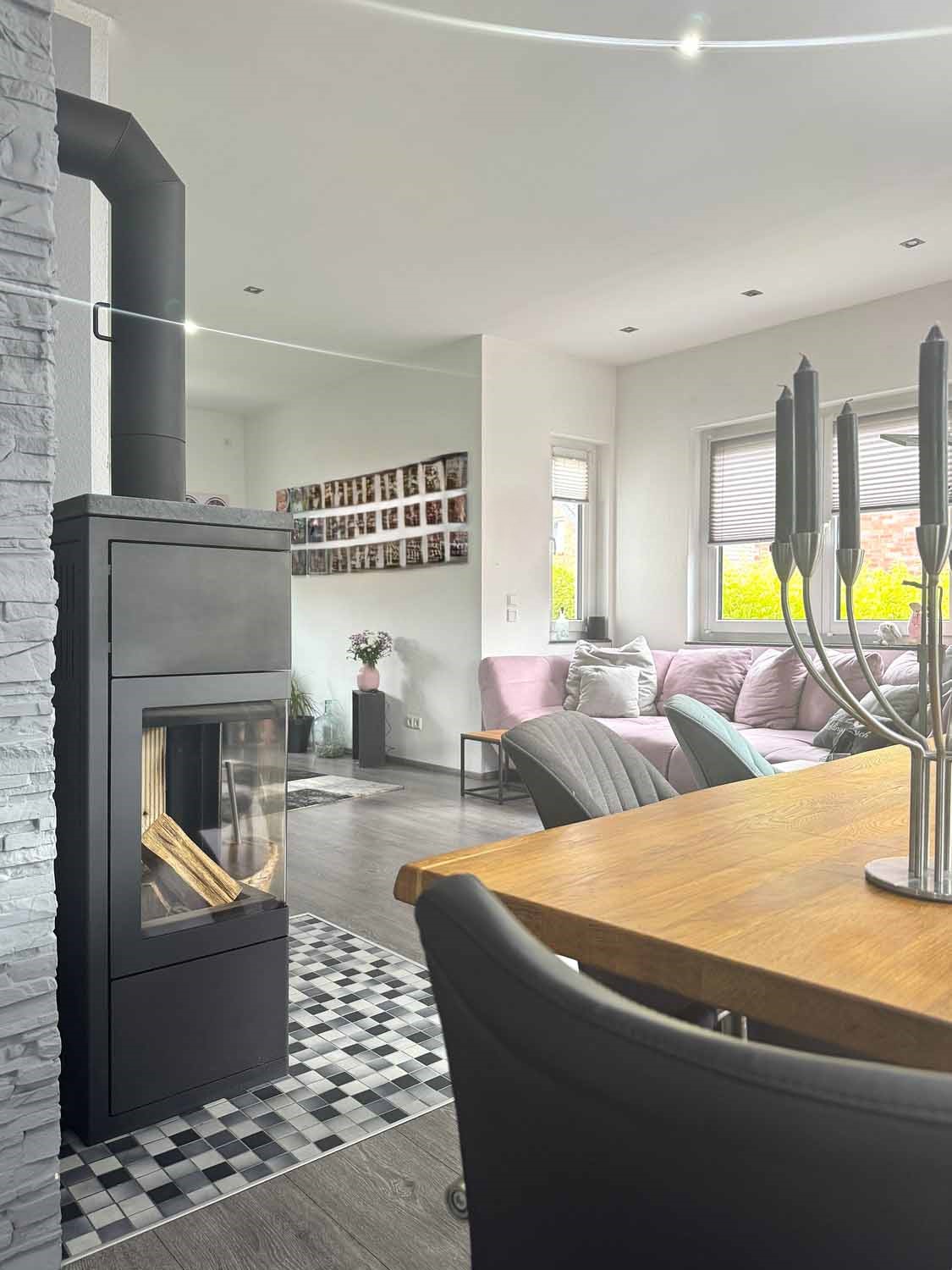 Wir betreten das ca. 436 m² große, eingezäunte und durch eine Bambushecke blickdichte Grundstück durch die Gartentür und blicken rechts auf eine gepflegte Rasenfläche und die Gartenhütte. Ein gepflasterter Weg führt zur Haustür. Wir betreten diese und stehen in der geräumigen hellen Diele mit ausreichend Platz für die Jacken und das Schuhregal. Eine Holztreppe führt ins erste Obergeschoss, aber wir sehen uns erst im Erdgeschoss um. Direkt rechts an der Diele liegt ein Hauswirtschaftsraum mit Stellplatz für Waschmaschine und Trockner. Die Gasheizung und Haustechnik befinden sich ebenfalls dort. Außerdem Platz für einige Lebensmittel oder auch Staubsauger und Co. Dahinter befindet sich das Gäste-WC. Mit seinen über 4 m², der ebenerdigen Dusche und dem Tageslichtfenster ist es allerdings eher ein vollwertiges Badezimmer. Modern ausgestattet mit großen grauen Fliesen und einer Handtuchheizung. Geradeaus durch eine Schiebetür gehen wir in die Küche. Sie ist im Kaufpreis enthalten. Der große Kühlschrank und die Kochinsel in der Mitte des Raumes fallen direkt ins Auge. Dort wird sich der Hobbykoch wohlfühlen. Direkt an der Küche liegt der offene Wohn- und Essbereich. Ausgestattet mit hochwertigem Laminatboden wird der ca. 35 m² große Raum sicher der Mittelpunkt des Familienlebens werden. Das Highlight in dem Zimmer ist der Kamin. Er sorgt im Winter für Gemütlichkeit und spart außerdem Heizkosten. Durch eine Glastür am Essbereich betreten wir den hinteren Teil des Gartens und stehen auf der großzügigen Terrasse. Ein Sonnensegel mit Edelstahlmasten sorgt hier im Sommer für genügend Schatten. Der Blick hinten aus dem Garten heraus ist grün, denn wir blicken direkt auf eine große Wiese, auf der hin und wieder Schafe grasen. Ein Blick hinauf auf das Dach verrät, dass sich zwei große Solarplatten auf dem Dach befinden. Diese dient der Warmwasserbereitung und sorgt für etwas Autarkie.
