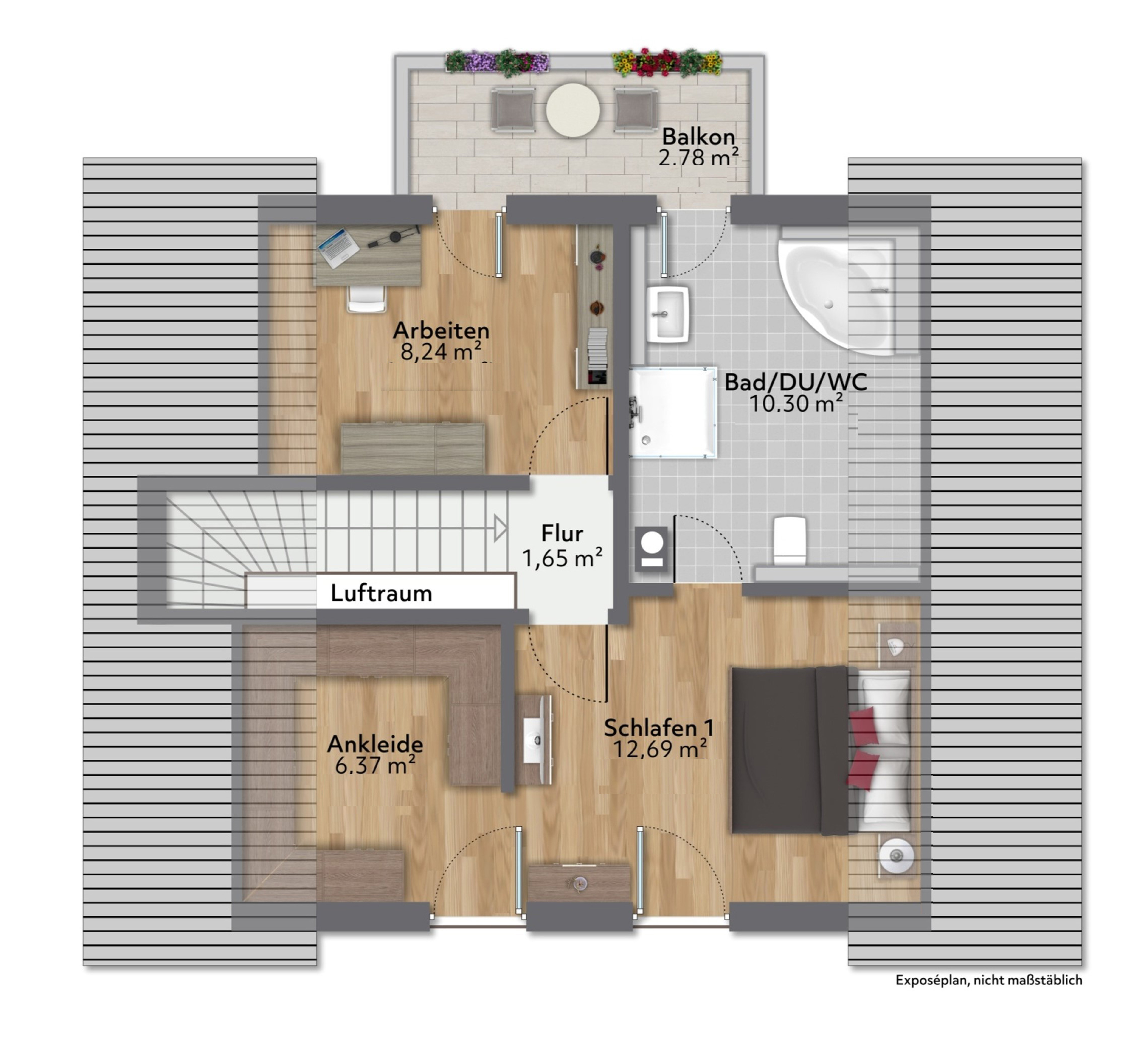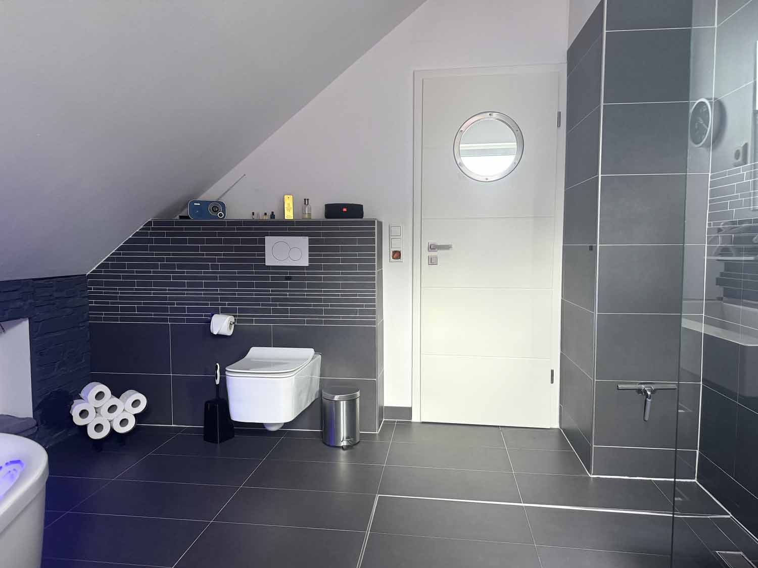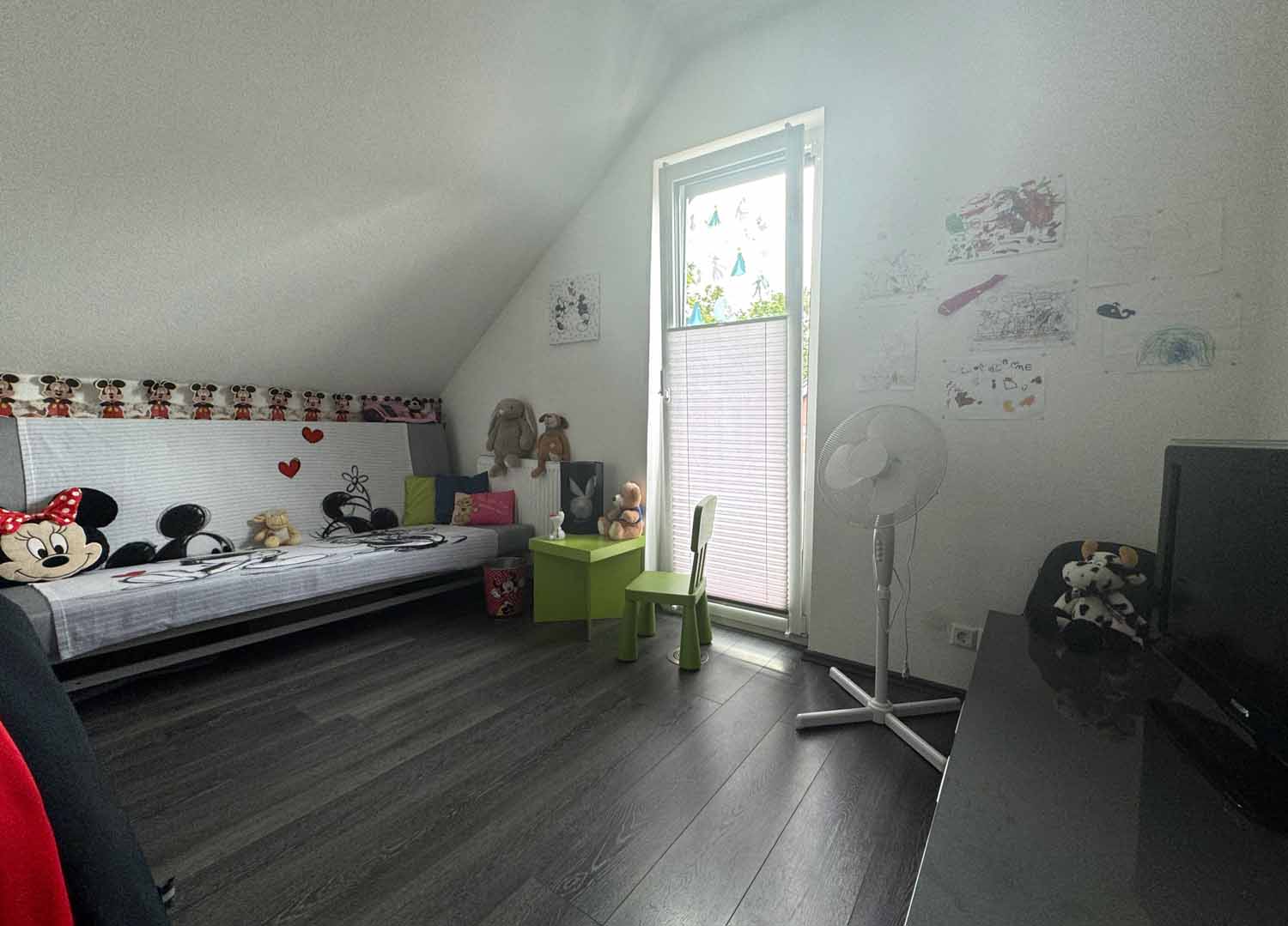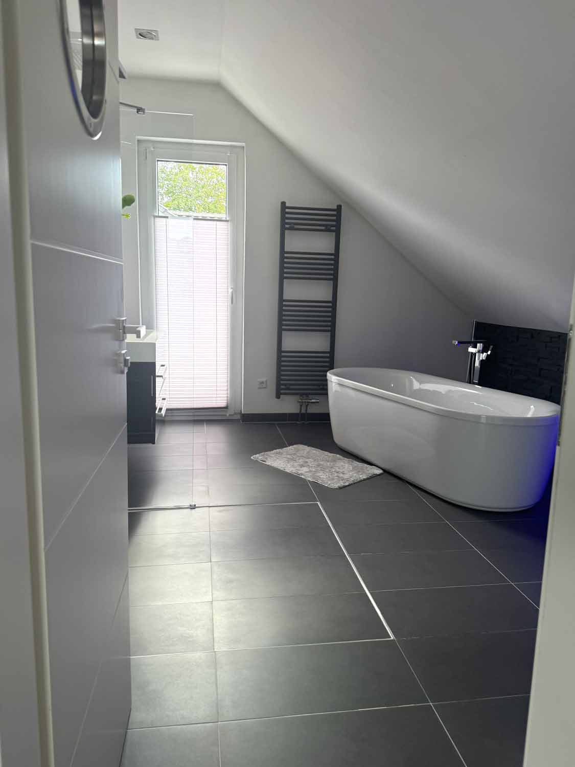 Zurück im Haus gehen wir die Holztreppe hinauf in das Obergeschoss. Dort befindet sich ein weiteres Zimmer mit knapp über 8 m², welches derzeit als Kinderzimmer dient. Von diesem und dem danebenliegenden Badezimmer führt eine Glastür auf den Süd-Balkon. Dort können Sie den ganzen Tag die Sonne genießen. Das Badezimmer ist mit seiner freistehenden Badewanne, der großen offenen Dusche und den dekorativen Lichtelementen etwas ganz Besonders. Ein schönes Highlight ist auch das Bullauge in der Badezimmertür. Also gibt es hier ein richtig schönes Bad en Suite. Rechts an der Treppe befindet sich der ca. 12 m² große Schlafbereich mit angrenzendem Ankleideraum. Dort werden sie sich wohlfühlen. Das Haus ist mit einem Wohnungslüftungs-System mit Wärmerückgewinnung ausgestattet. Es tauscht die Luft in den Wohnräumen für ein gesundes, behagliches Raumklima kontinuierlich aus und entfernen Geruchs- und Schadstoffe.