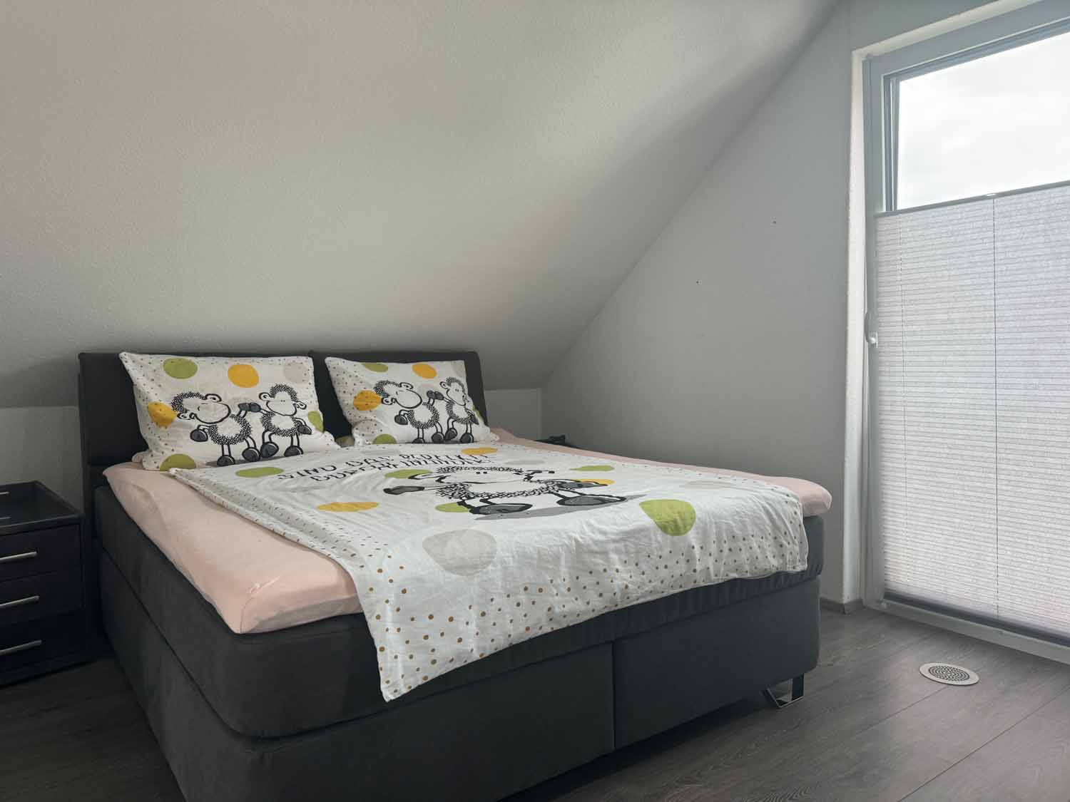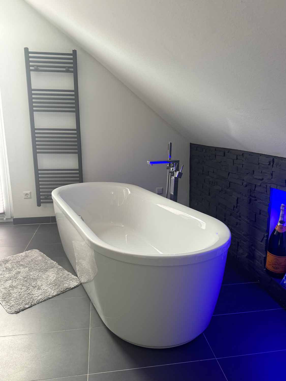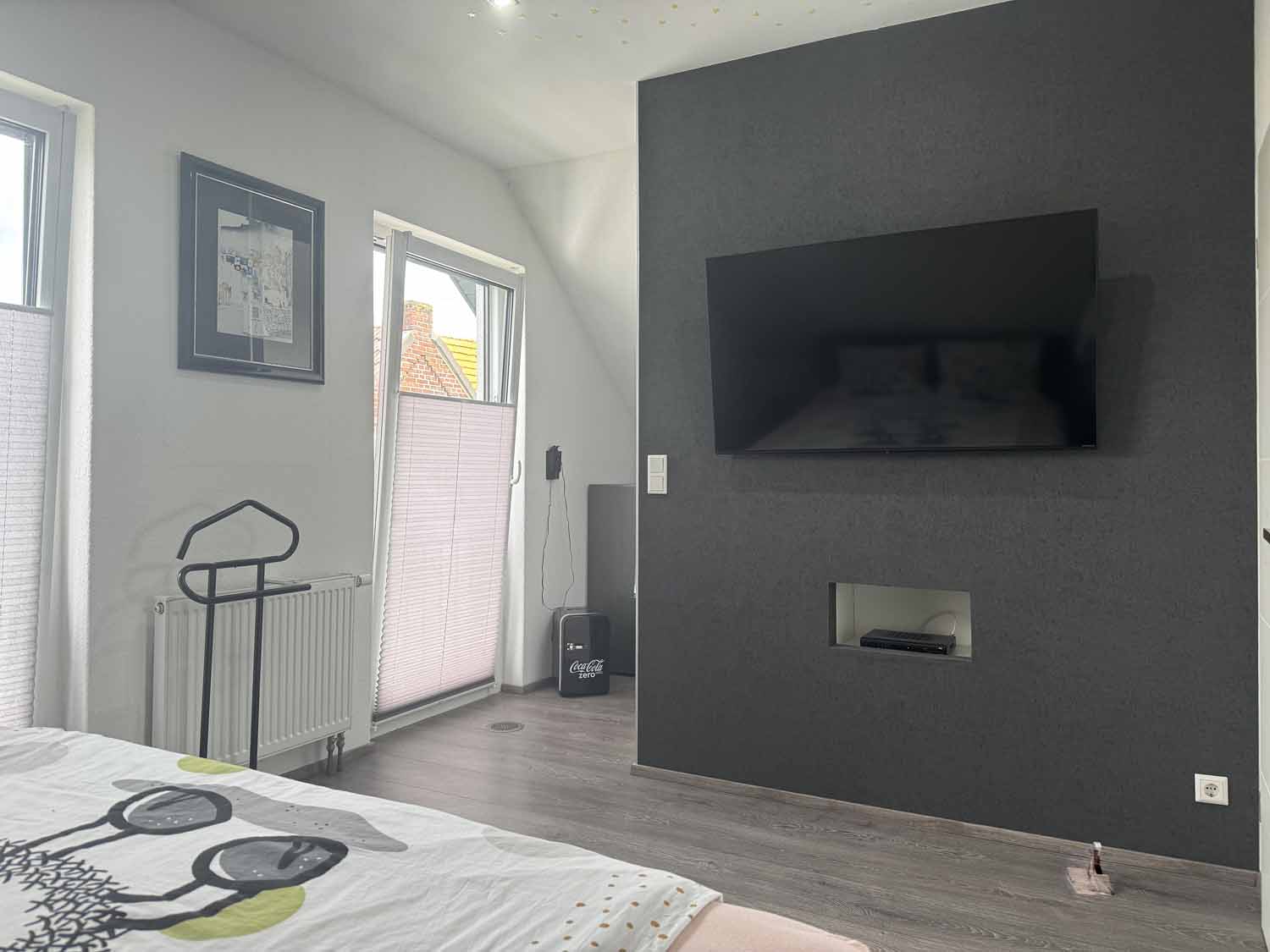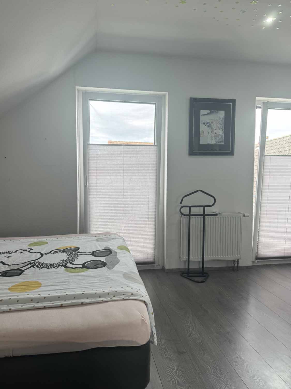 Zurück im Haus gehen wir die Holztreppe hinauf in das Obergeschoss. Dort befindet sich ein weiteres Zimmer mit knapp über 8 m², welches derzeit als Kinderzimmer dient. Von diesem und dem danebenliegenden Badezimmer führt eine Glastür auf den Süd-Balkon. Dort können Sie den ganzen Tag die Sonne genießen. Das Badezimmer ist mit seiner freistehenden Badewanne, der großen offenen Dusche und den dekorativen Lichtelementen etwas ganz Besonders. Ein schönes Highlight ist auch das Bullauge in der Badezimmertür. Also gibt es hier ein richtig schönes Bad en Suite. Rechts an der Treppe befindet sich der ca. 12 m² große Schlafbereich mit angrenzendem Ankleideraum. Dort werden sie sich wohlfühlen. Das Haus ist mit einem Wohnungslüftungs-System mit Wärmerückgewinnung ausgestattet. Es tauscht die Luft in den Wohnräumen für ein gesundes, behagliches Raumklima kontinuierlich aus und entfernen Geruchs- und Schadstoffe.