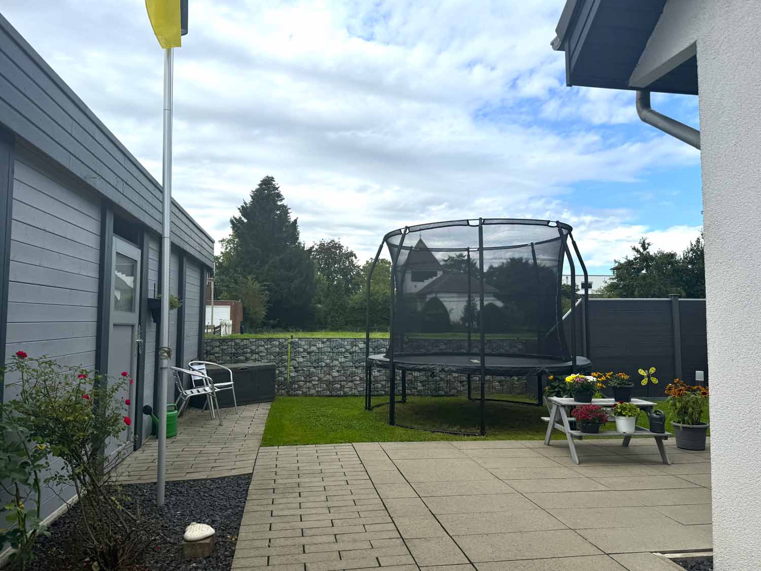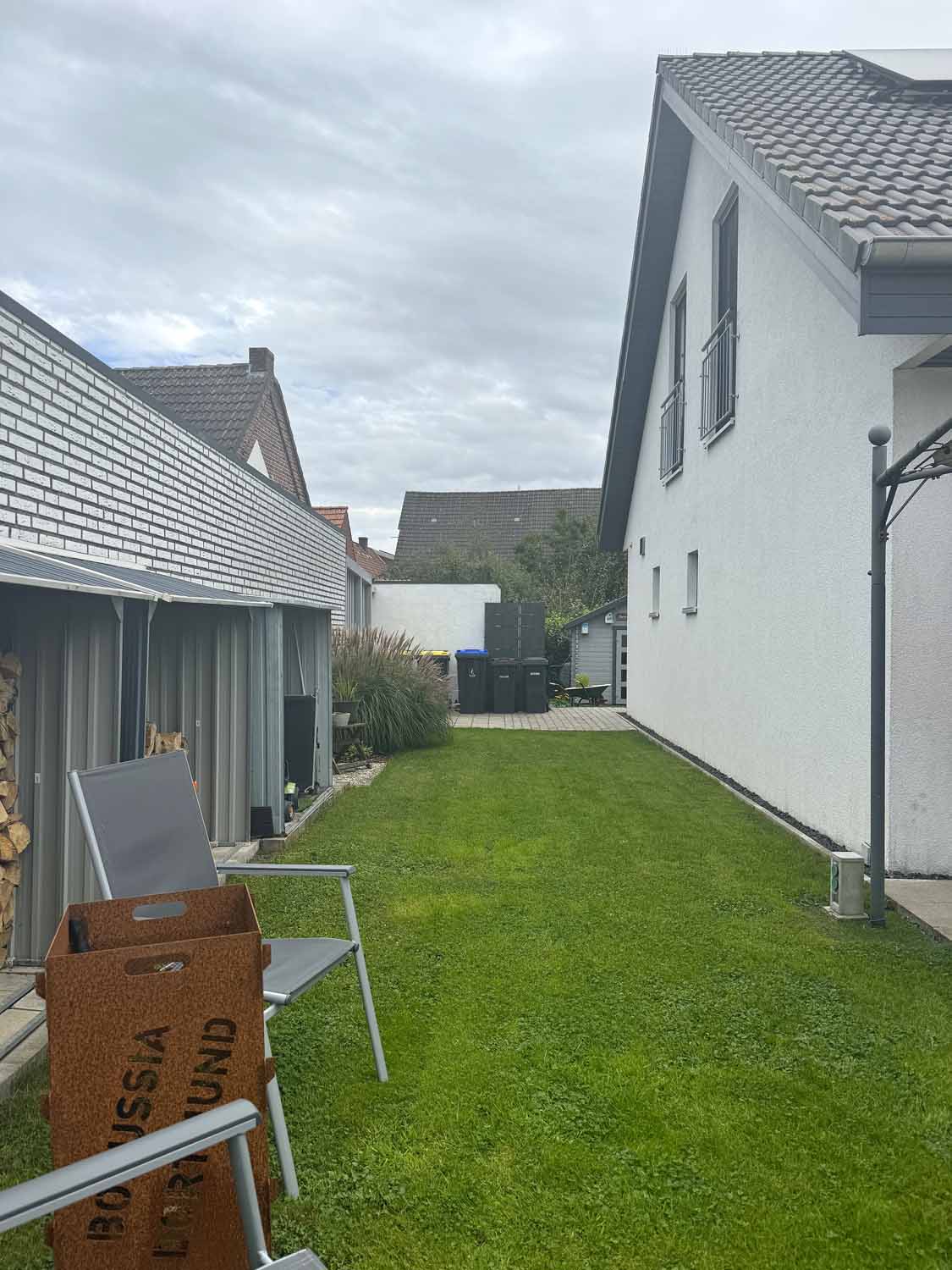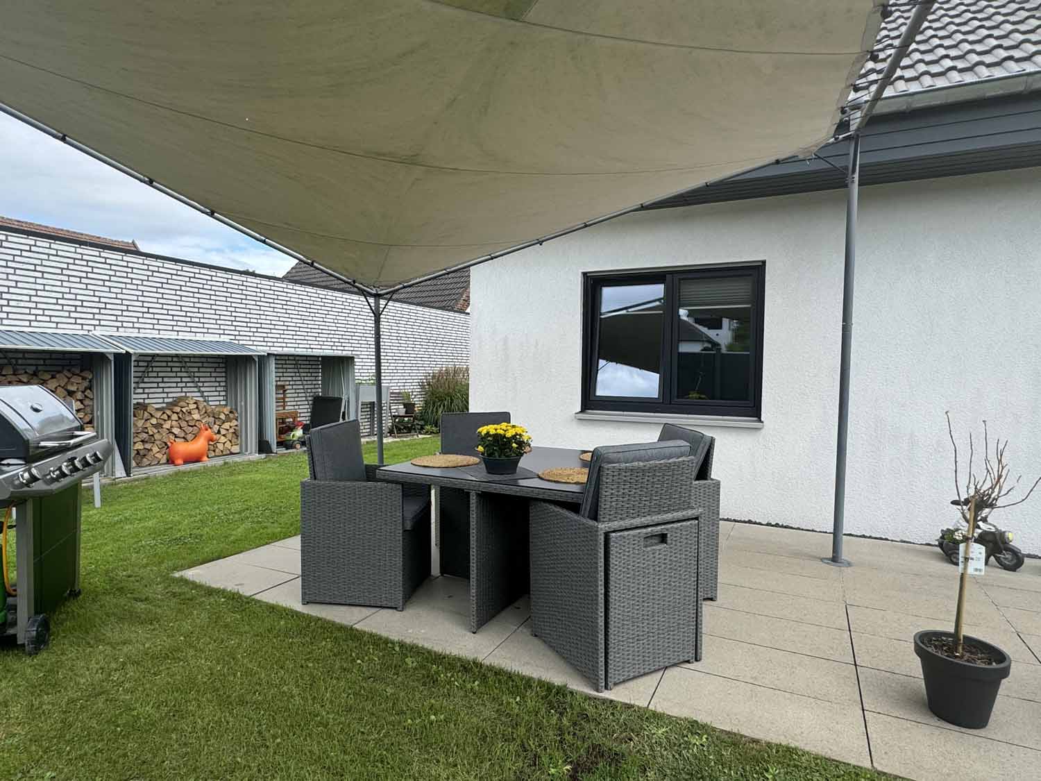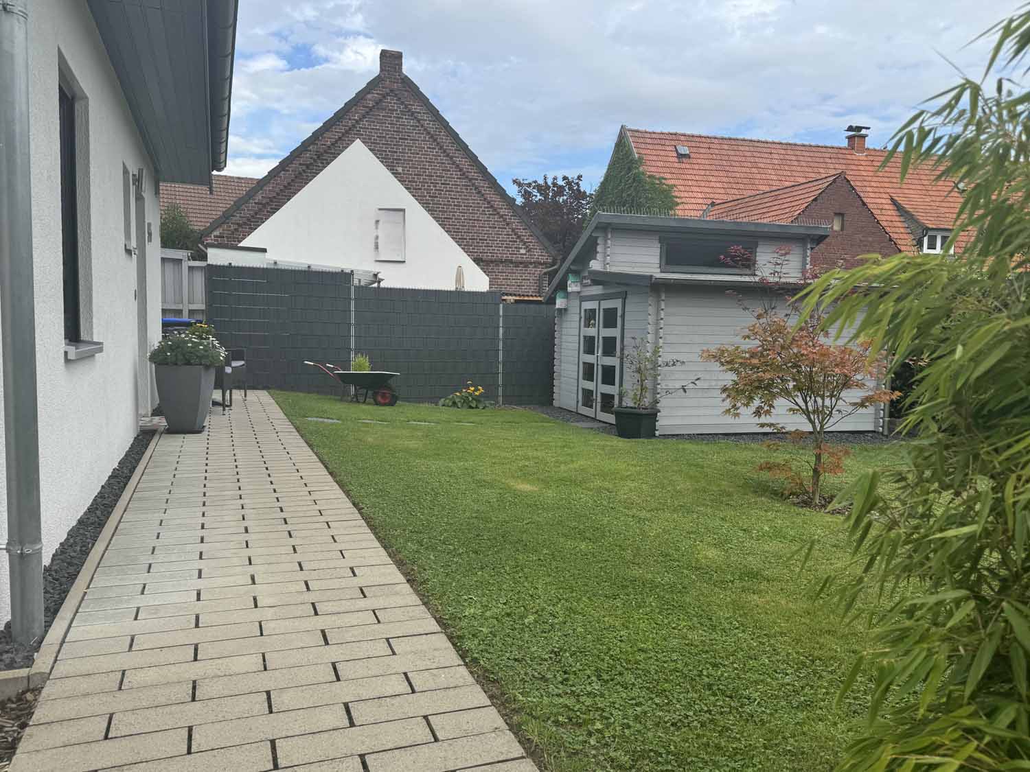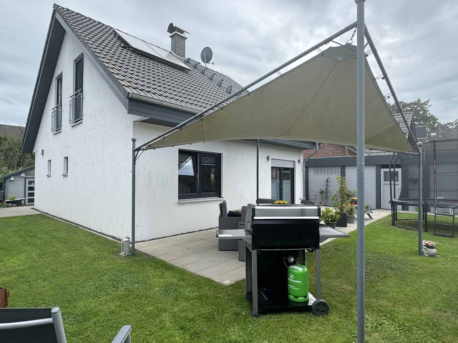 Aber schauen wir uns das Haus aus dem Baujahr 2015 doch einmal genauer an. Es handelt sich um ein Haus in Holzständerbauweise. Die Holzpfosten oder Holzständer sind dabei die Stützpfeiler des Hauses und bilden zusammen mit den horizontalen Trägern das Grundgerüst eines Fertighauses in Holzständerbauweise. Durch diese einfache und dennoch sehr stabile Konstruktion können jederzeit weitere Wände in Ständerbauweise im Hausinneren aufgestellt werden. Bei diesem Haus handelt sich sogar um ein KfW 70 Haus. Wir stehen vor dem Haus und blicken links die lange Auffahrt hinauf zur Garage. Hier finde Ihre und auch die Besucherautos Platz. Die Garage ist mit einem elektrischen Garagentor ausgestattet und verfügt im hinteren Teil über einen zusätzlichen Schuppen. Praktisch für Fahrräder und Gartengeräte. Benötigen Sie etwas Platz, so steht eine geräumige, ebenfalls in modernem Grau gestrichene Gartenhütte auf dem vorderen rechten Teil des Grundstücks. Sie sehen an Stellfläche wird es trotz des nicht vorhandenen Kellers nicht fehlen.