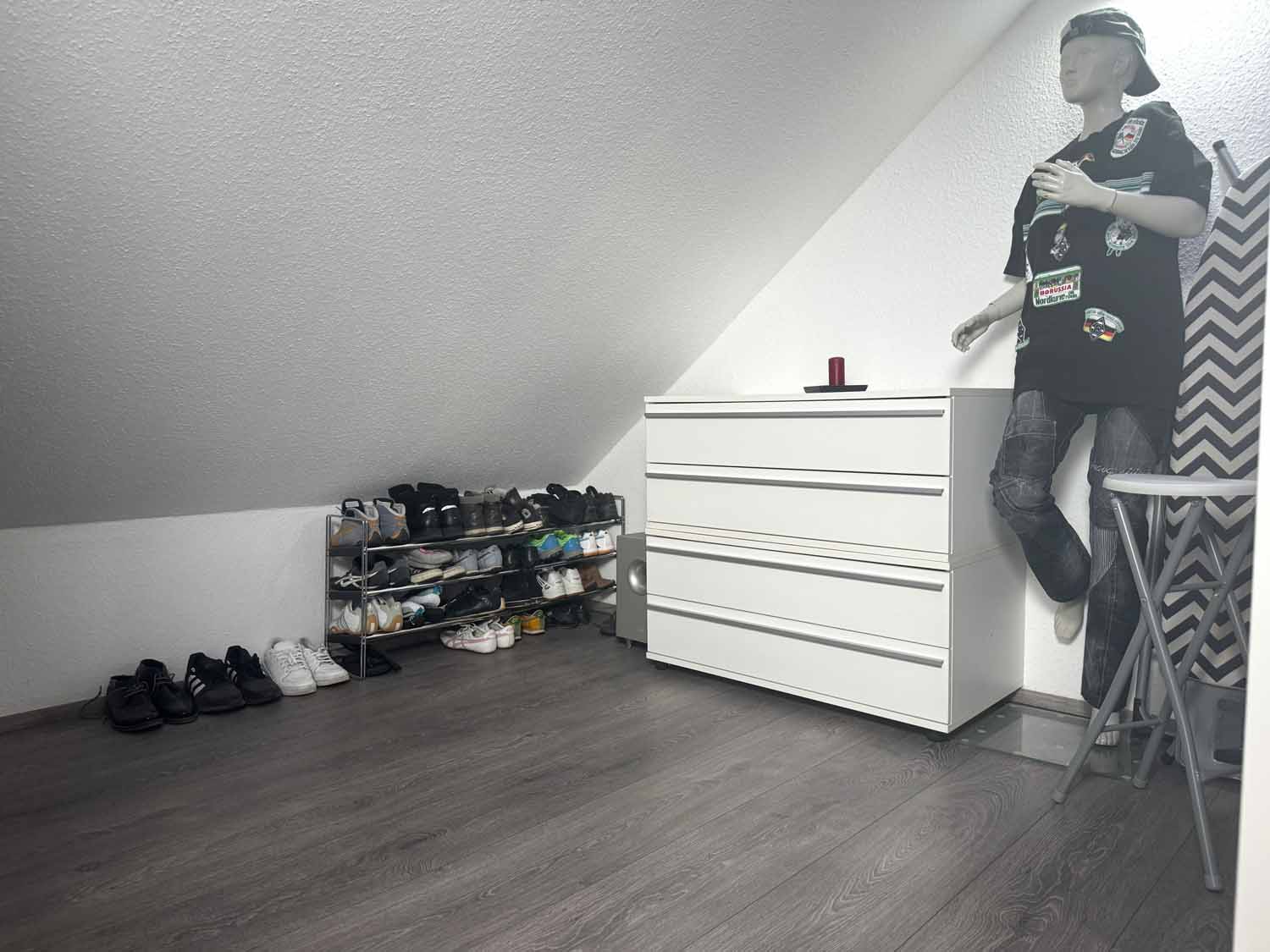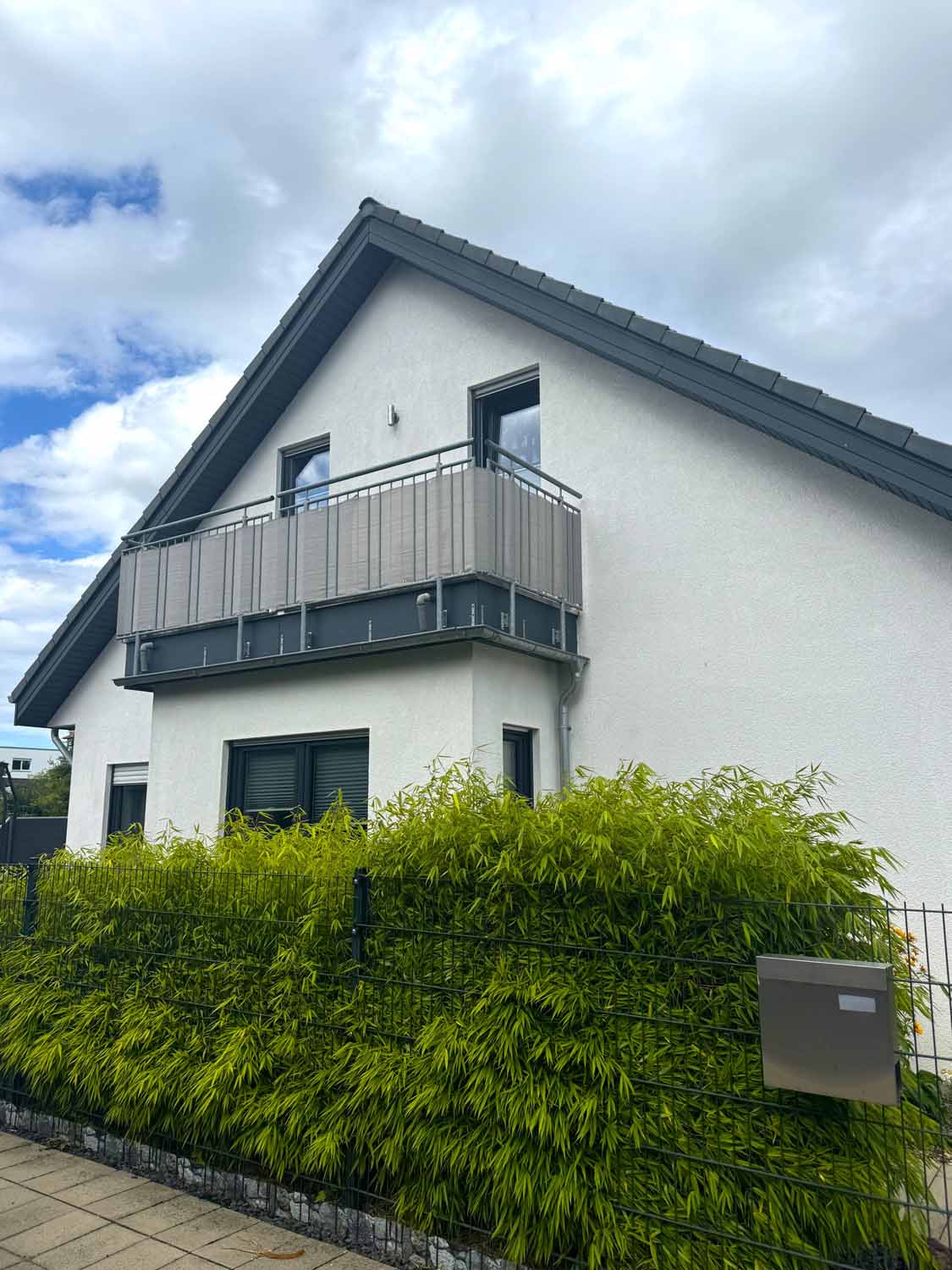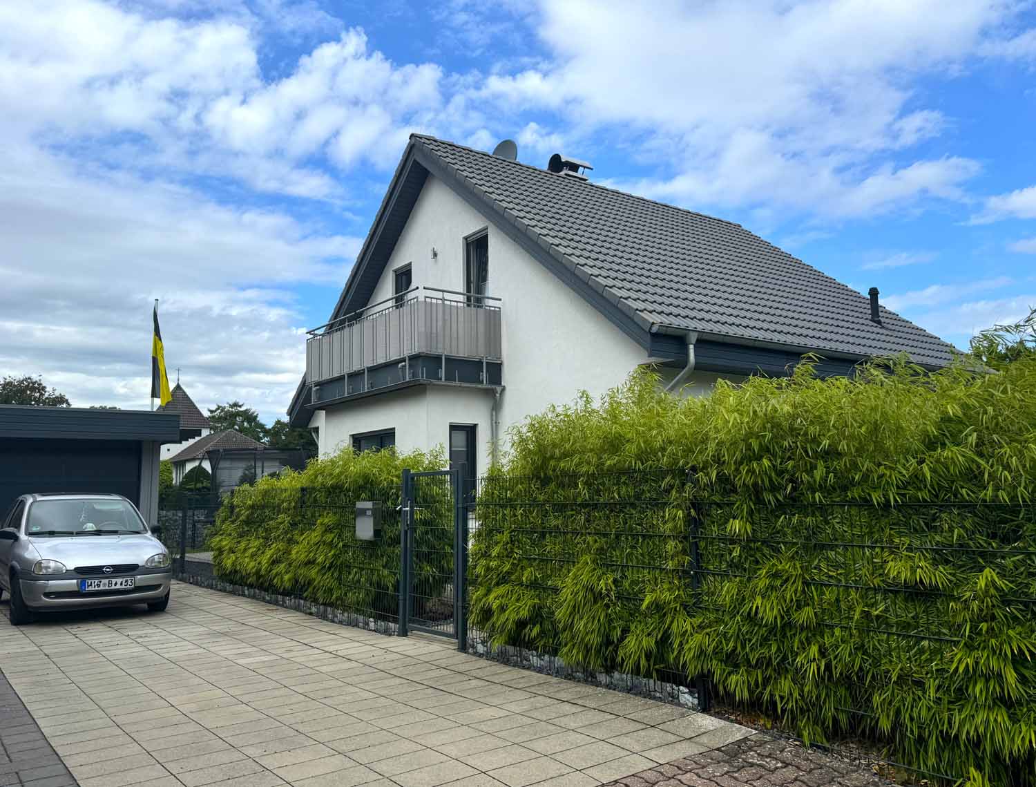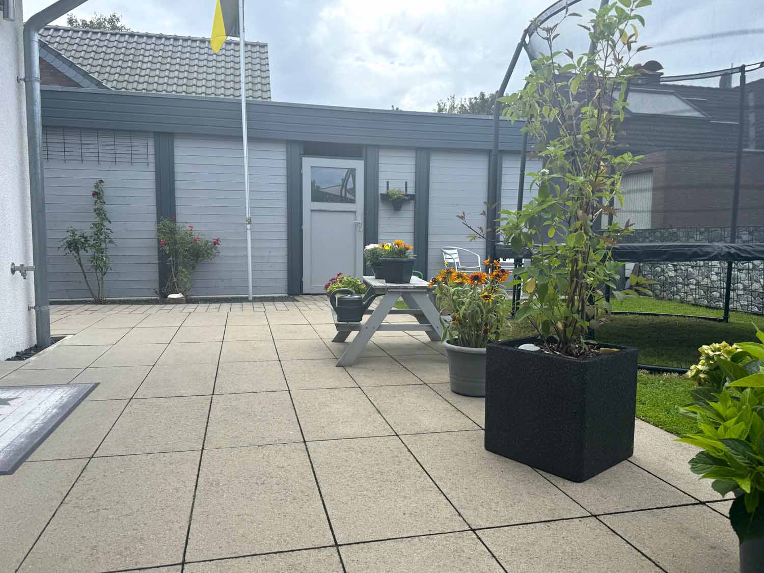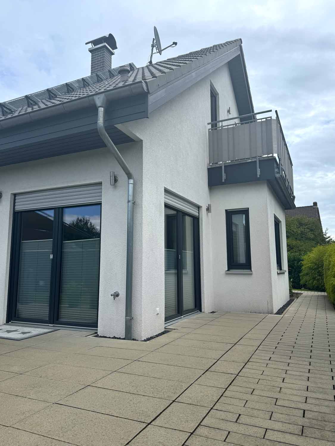 Aber schauen wir uns das Haus aus dem Baujahr 2015 doch einmal genauer an. Es handelt sich um ein Haus in Holzständerbauweise. Die Holzpfosten oder Holzständer sind dabei die Stützpfeiler des Hauses und bilden zusammen mit den horizontalen Trägern das Grundgerüst eines Fertighauses in Holzständerbauweise. Durch diese einfache und dennoch sehr stabile Konstruktion können jederzeit weitere Wände in Ständerbauweise im Hausinneren aufgestellt werden. Bei diesem Haus handelt sich sogar um ein KfW 70 Haus. Wir stehen vor dem Haus und blicken links die lange Auffahrt hinauf zur Garage. Hier finde Ihre und auch die Besucherautos Platz. Die Garage ist mit einem elektrischen Garagentor ausgestattet und verfügt im hinteren Teil über einen zusätzlichen Schuppen. Praktisch für Fahrräder und Gartengeräte. Benötigen Sie etwas Platz, so steht eine geräumige, ebenfalls in modernem Grau gestrichene Gartenhütte auf dem vorderen rechten Teil des Grundstücks. Sie sehen an Stellfläche wird es trotz des nicht vorhandenen Kellers nicht fehlen.